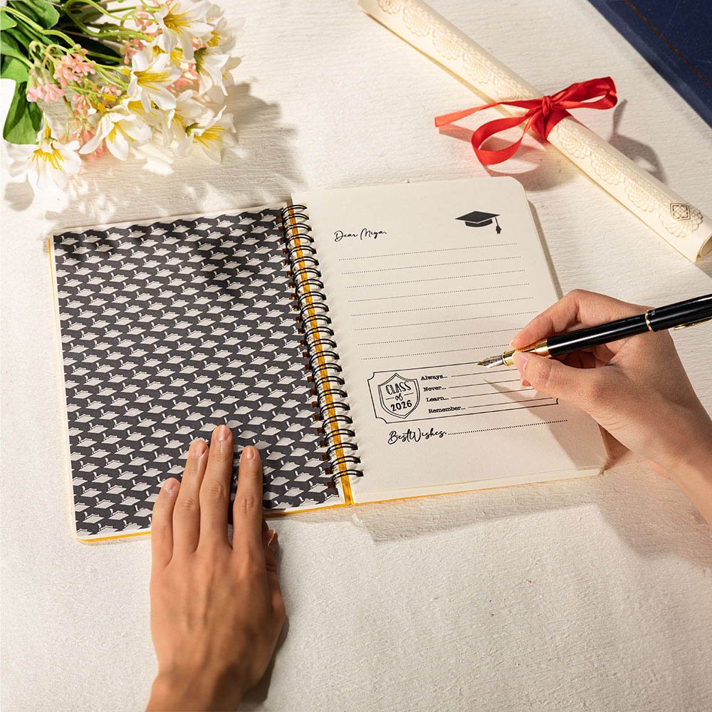 This exquisite guest book is the perfect way to immortalize the graduate's accomplishments and make their celebration unique. The customizable cover allows you to proudly display the graduate's name and school name, transforming this keepsake into a Personalised memento that will be treasured for years.