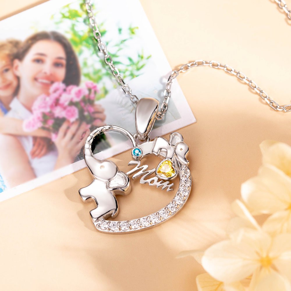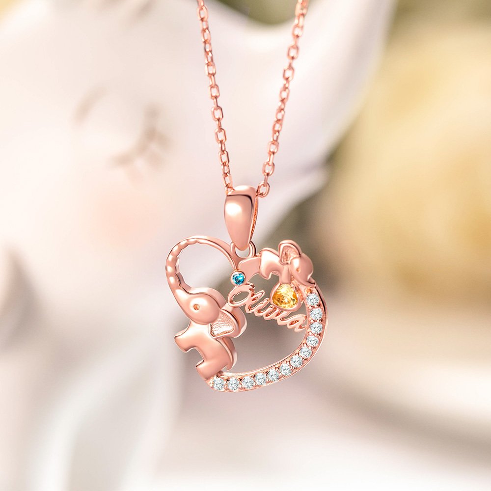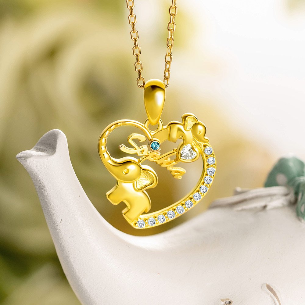 •This necklace is a joyful must-have for mothers. The elephant’s trunk and the arc gems form a love shape. The mom elephant’s nose is vividly upward, showing the image of the elephant very lively. A small elephant is carved in the upper right corner, making the overall design cute and warm. The round gem represents the mother, and the love gem represents the child. Let the mother and the child be closely linked.