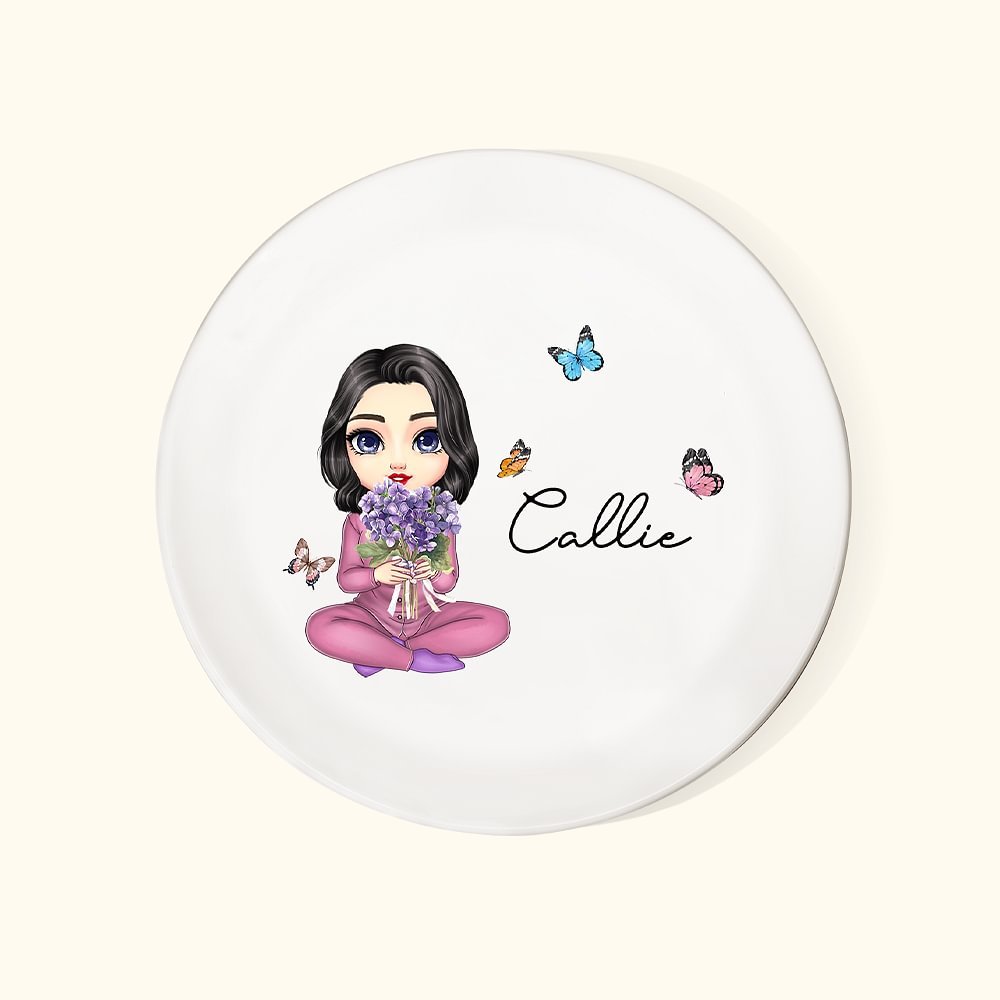 This Personalised jewellery dish features a charming cartoon character design and a bouquet of freely matchable birth flowers that can represent family members or friends, making it a perfect gift that reflects personality and love. You can also customize the recipient's name on it.