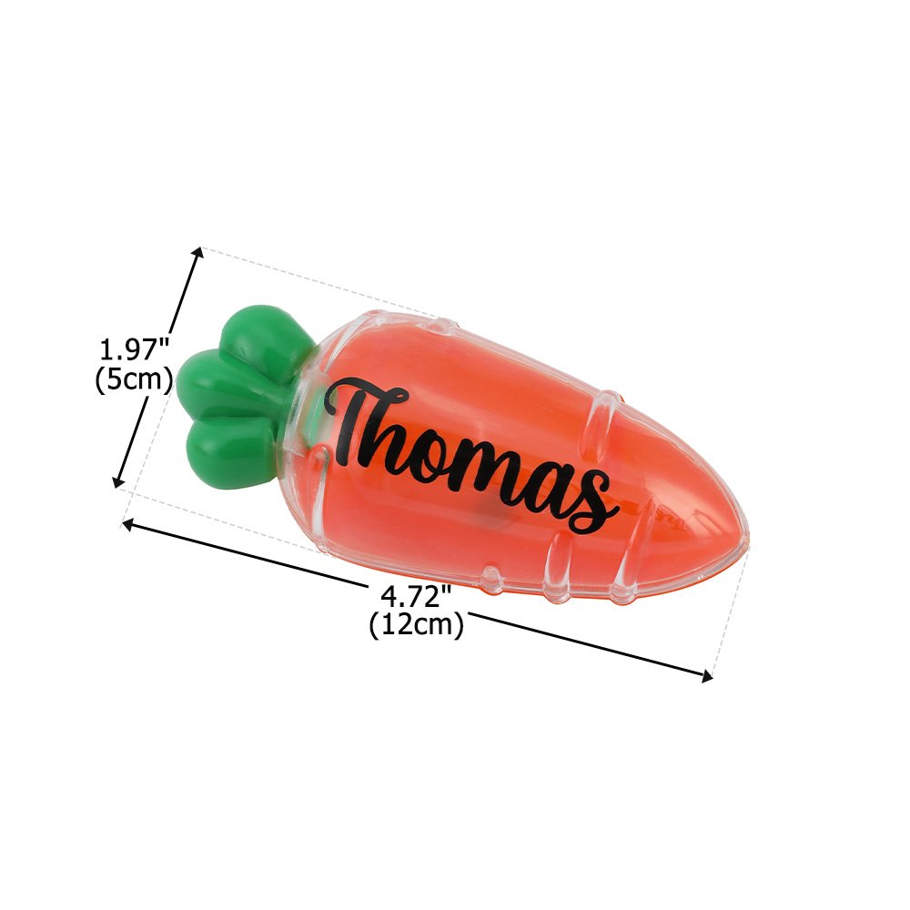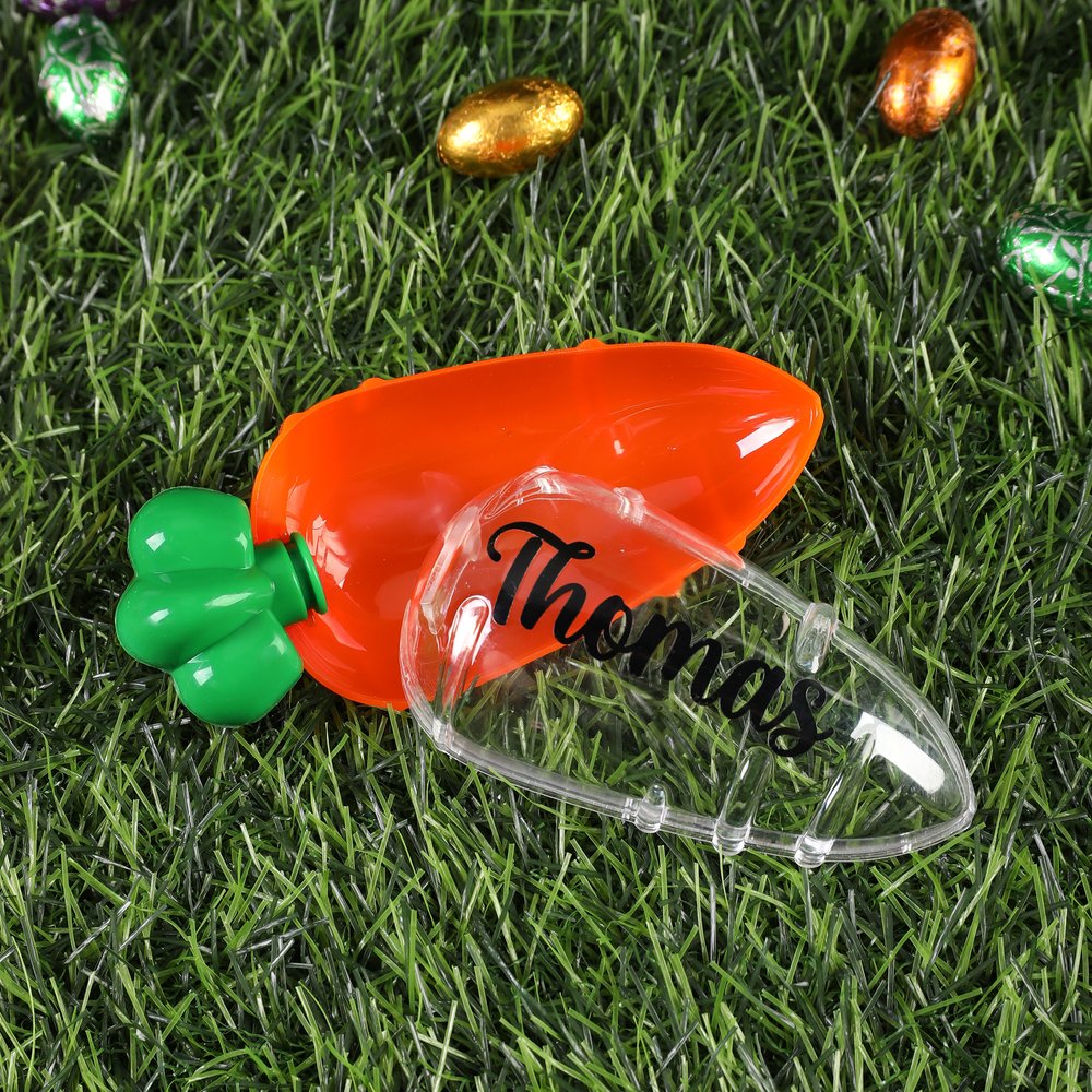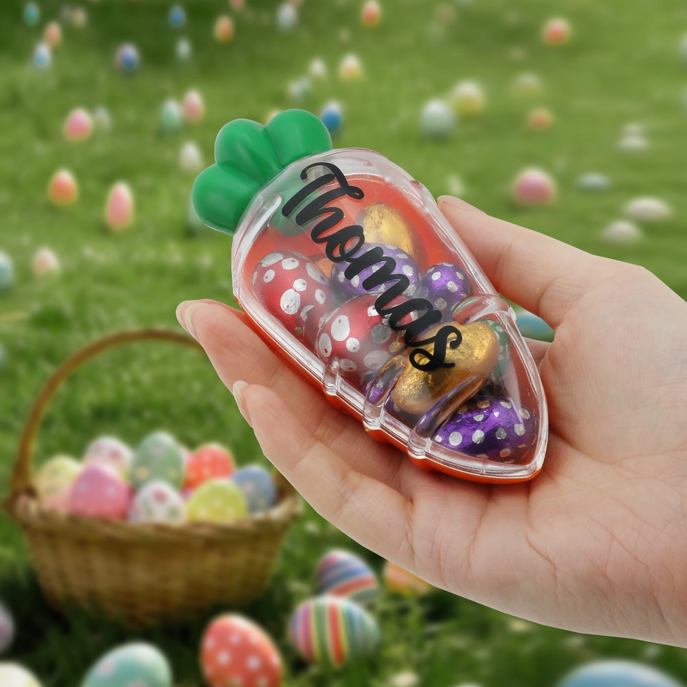 This Sweets box features a playful carrot shape and a customizable name. The vibrant orange color paired with emerald green leaf details captures the joyful atmosphere of Easter. The transparent, openable design makes it easy to fill with your favorite candies, adding a touch of ritual to every treasure hunt and gift-giving experience.
