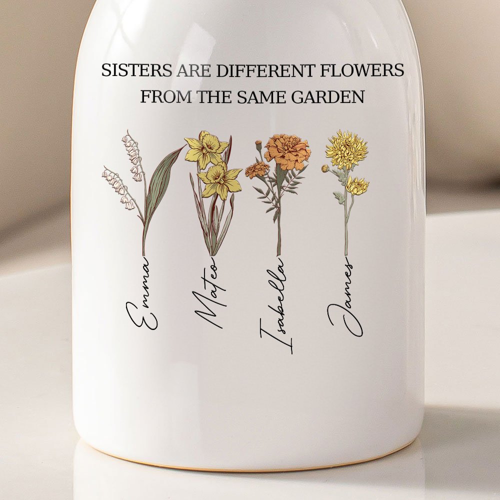 This ceramic vase beautifully combines 1-10 birth flowers with the touching phrase "Sisters Are Different Flowers From The Same Garden." Each birth flower represents a sister or friend, creating a visual representation of your shared bond. The fixed text highlights how each individual is unique yet connected. This design thoughtfully balances personalization with a universal message of love, making it a powerful symbol of your relationship.