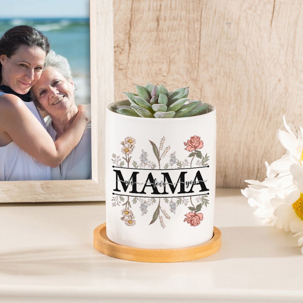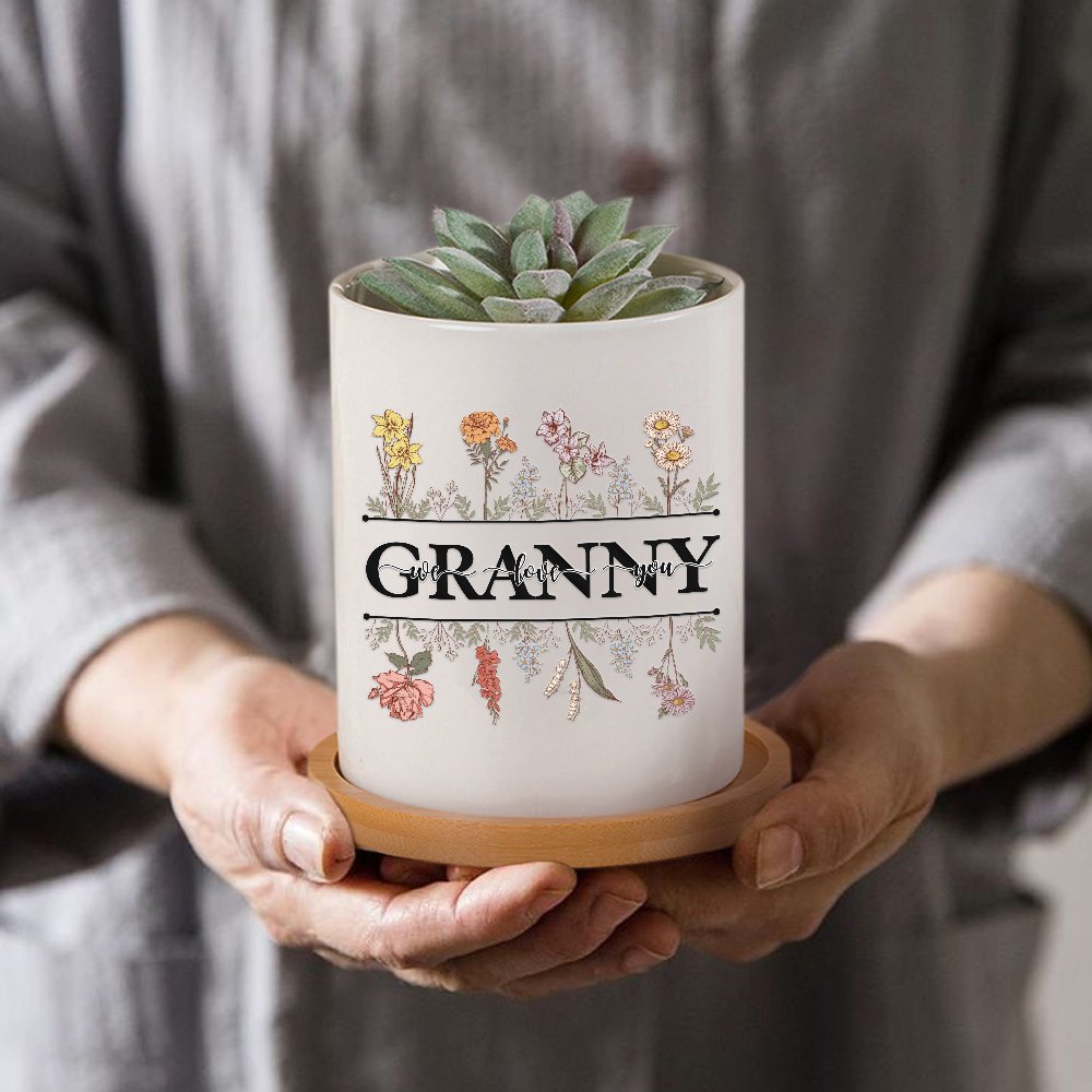 This planter pot features 1-12 watercolor birth flowers, with a customizable title and text in the middle, conveying happiness and warmth, creating a one-of-a-kind keepsake.