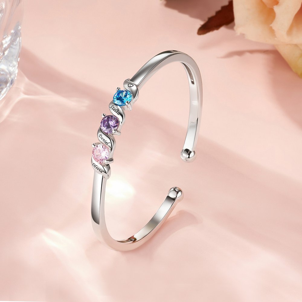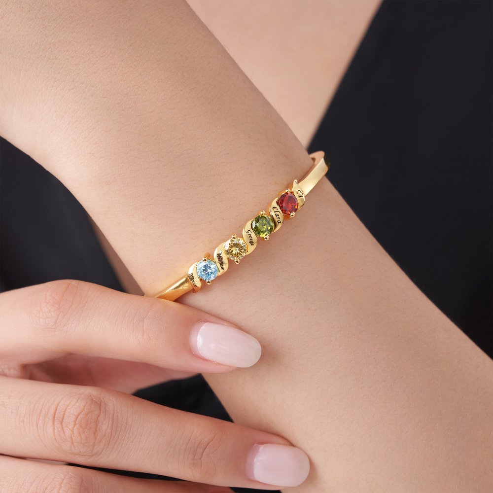 Choose one to five birthstones representing family members, each with a custom name engraving, making the bracelet a unique symbol of your family's story. Each gemstone holds a precious memory, imbuing the piece with warmth and meaning.