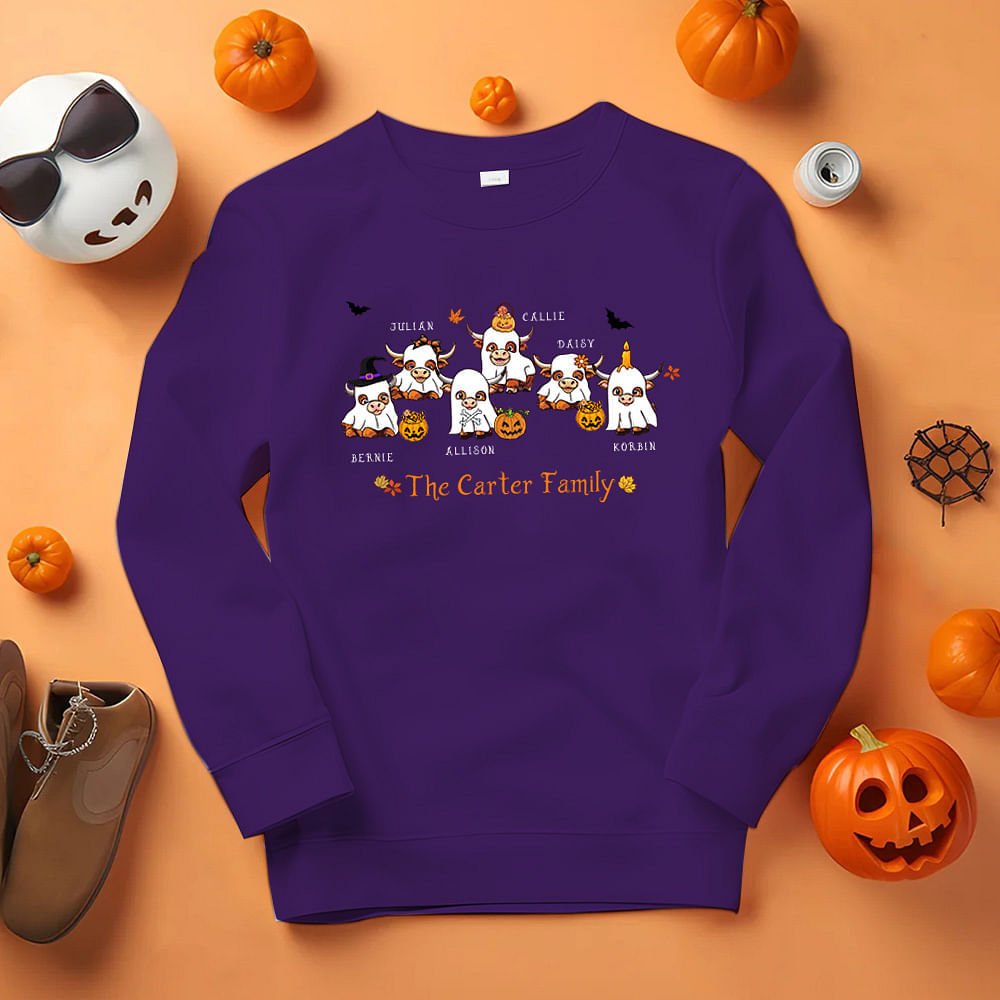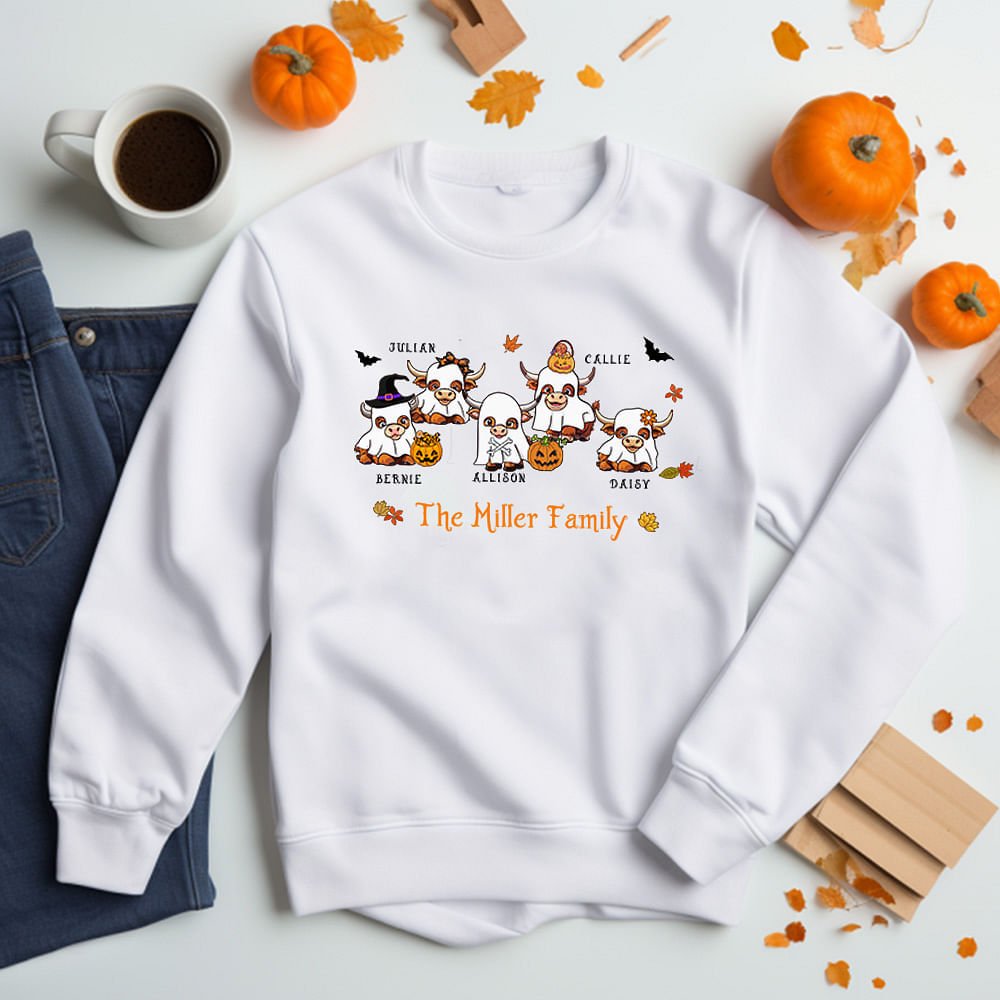Our sweatshirts are uniquely designed, combining ghosts with Highland cattle to create a cute, Halloween-themed design. There are 8 different styles, capturing Highland cattle's various movements and expressions, showing cute, playful, elegant, childlike, and other styles, enhancing the Halloween spirit and bringing a joyful and festive atmosphere to any Halloween event.