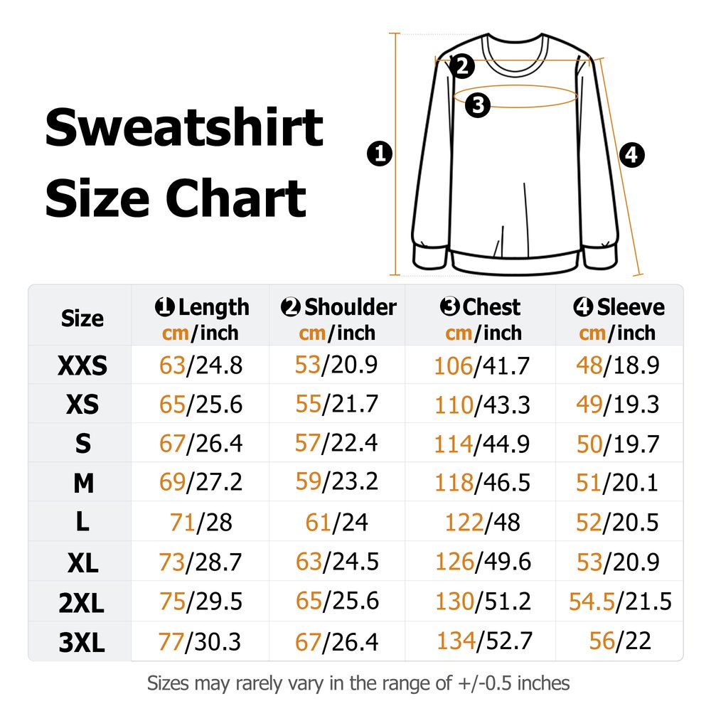 | Measurement: | Sweatshirt - XXS, XS, S, M, L, XL, 2XL, 3XL Hoodie - XXS, XS, S, M, L, XL, 2XL, 3XL |
