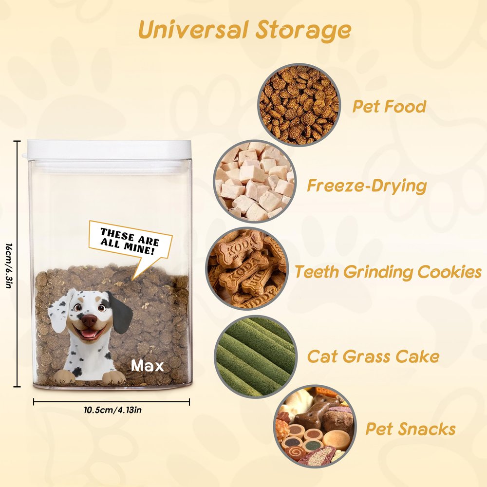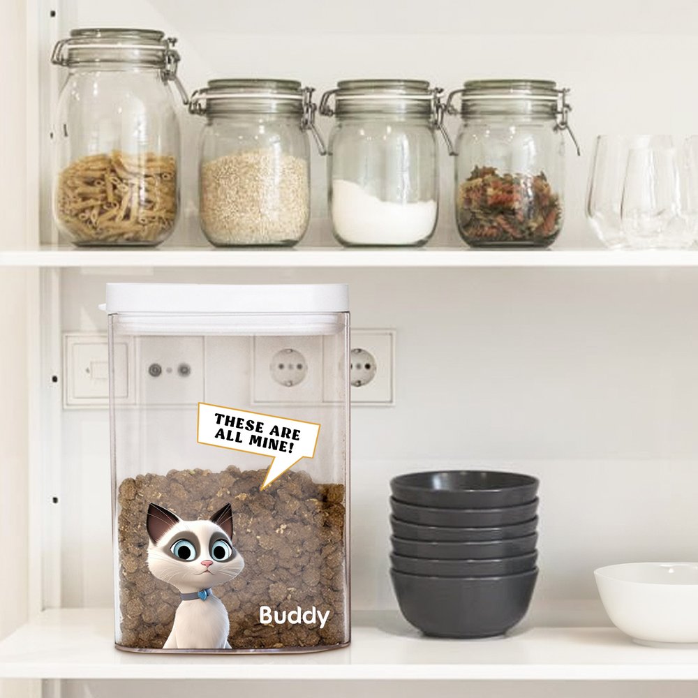 Our pet food storage canister features a cute, lifelike 3D cartoon dog cat graphic that captures your pet's lively personality and spirit. You can choose your pet's breed and add their name, with a humorous "THESE ARE ALL MINE!" message for added humor.