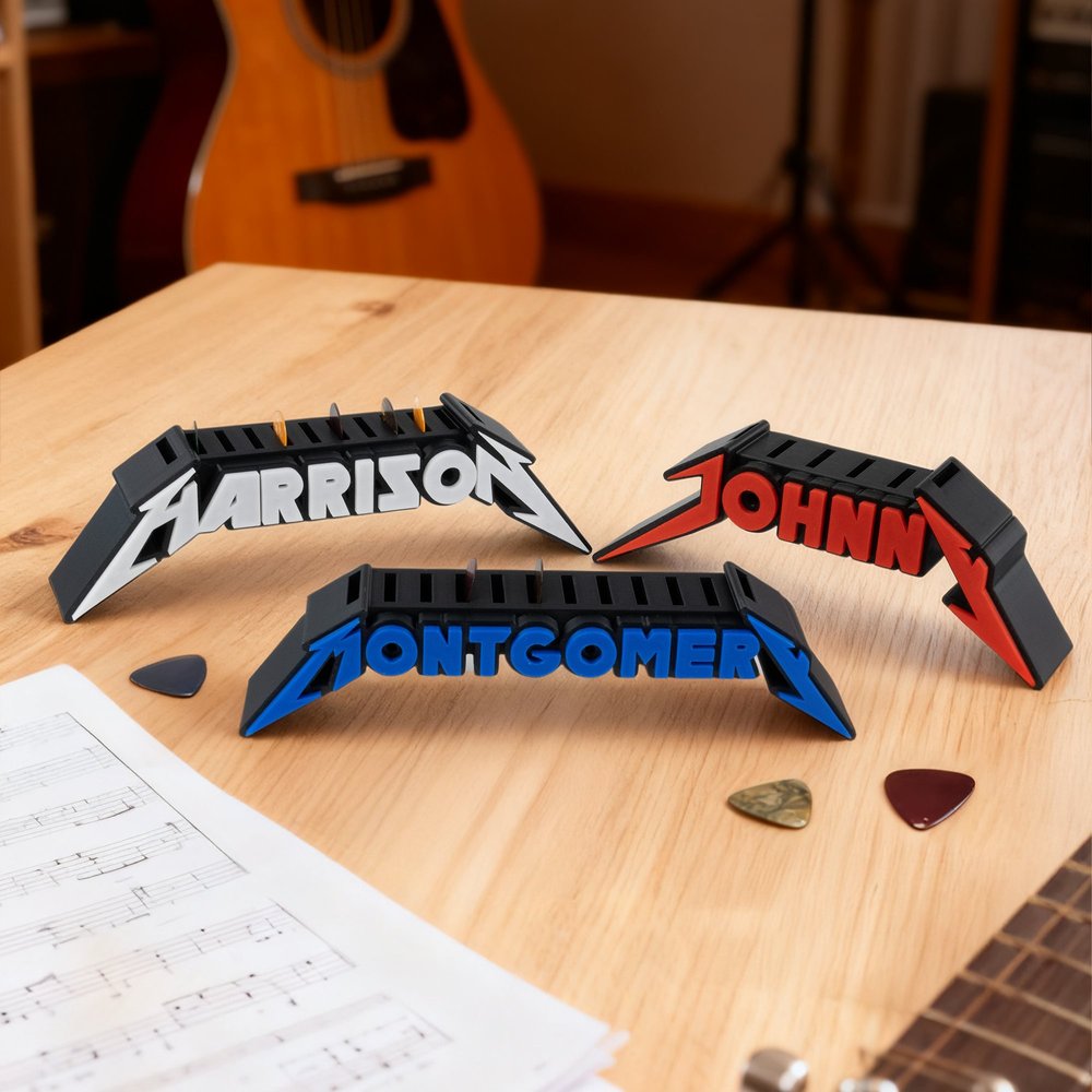 This Personalised guitar pick holder draws inspiration from heavy metal music, featuring bold rock-style typography. Blends avant-garde aesthetics with practical functionality, celebrating rock culture and personal expression.