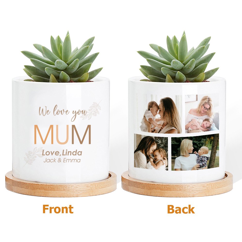 There are 4 photos on the design of this flowerpot, you can upload the photos according to your preferences. You can also customize a message and name on it to show your mother, grandmother, or other family members that she is always in your heart and remind her of your love every day.