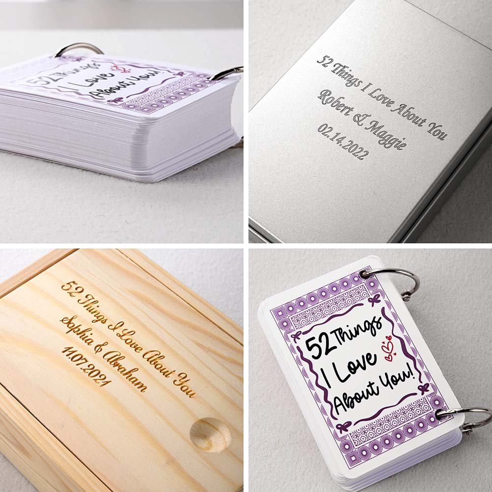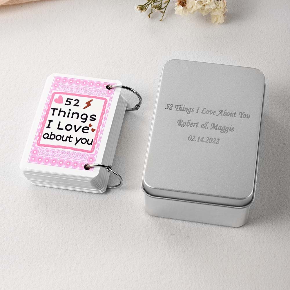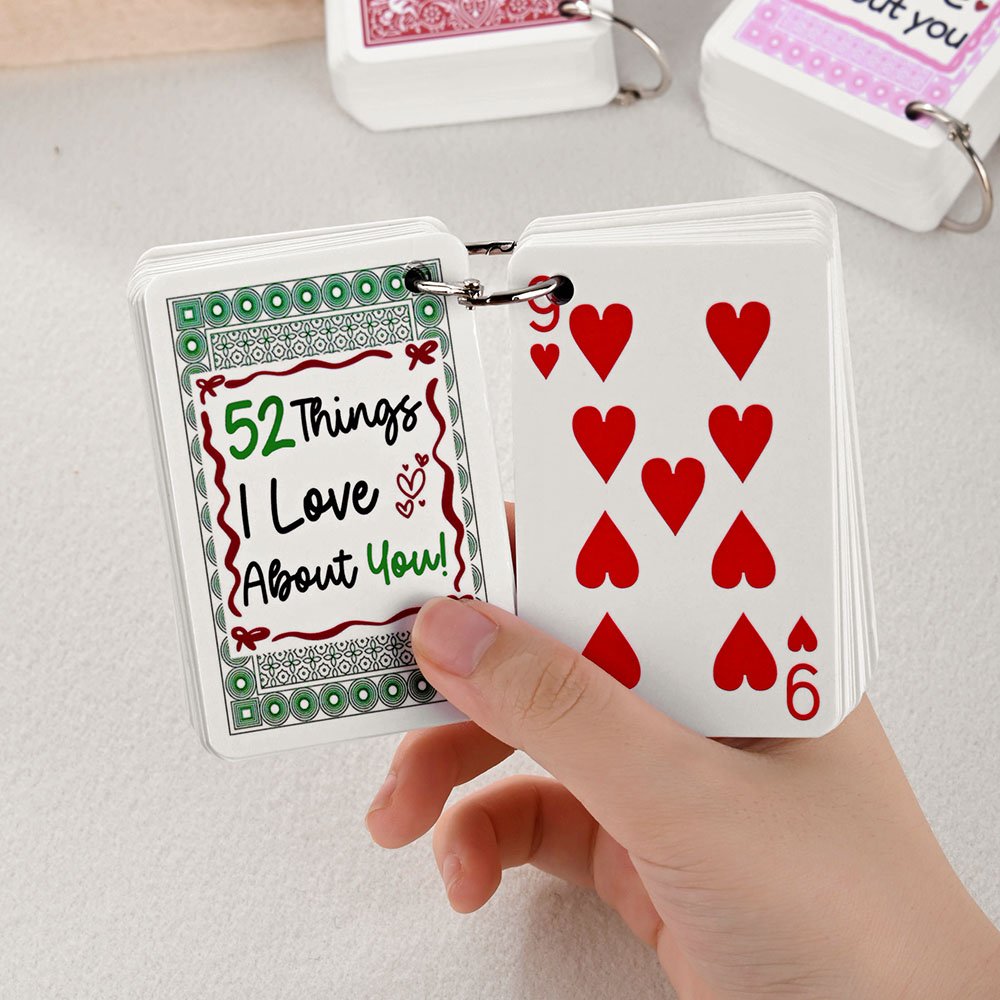 This deck of cards is customizable: you can choose the version with the fixed text "52 Things I Love About You" or opt for blank cards—write Personalised blessings on each one, celebrating your love with heartfelt words.