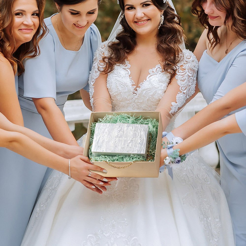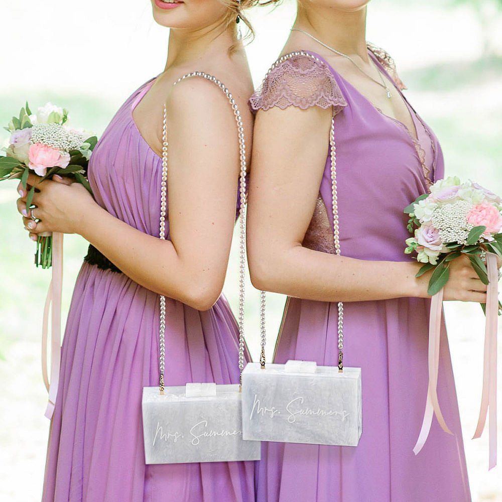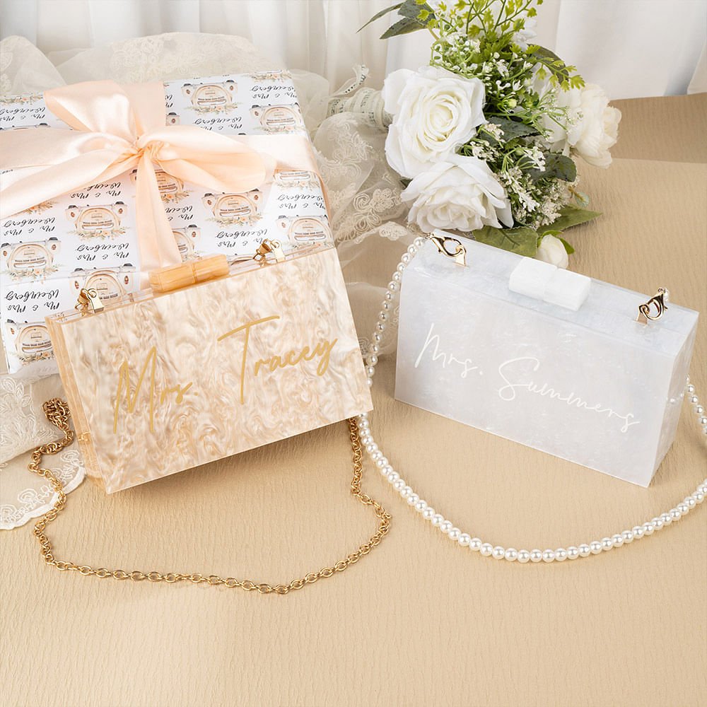 This bag is simple and elegant in design. The transparent and shiny bag is paired with a custom name, pearl chains or delicate gold chains, symbolizing the purity and beauty of this marriage, and also represents the beginning and commitment of marriage, adding a perfect combination of modern and traditional to the bride's or bridesmaid's outfit.