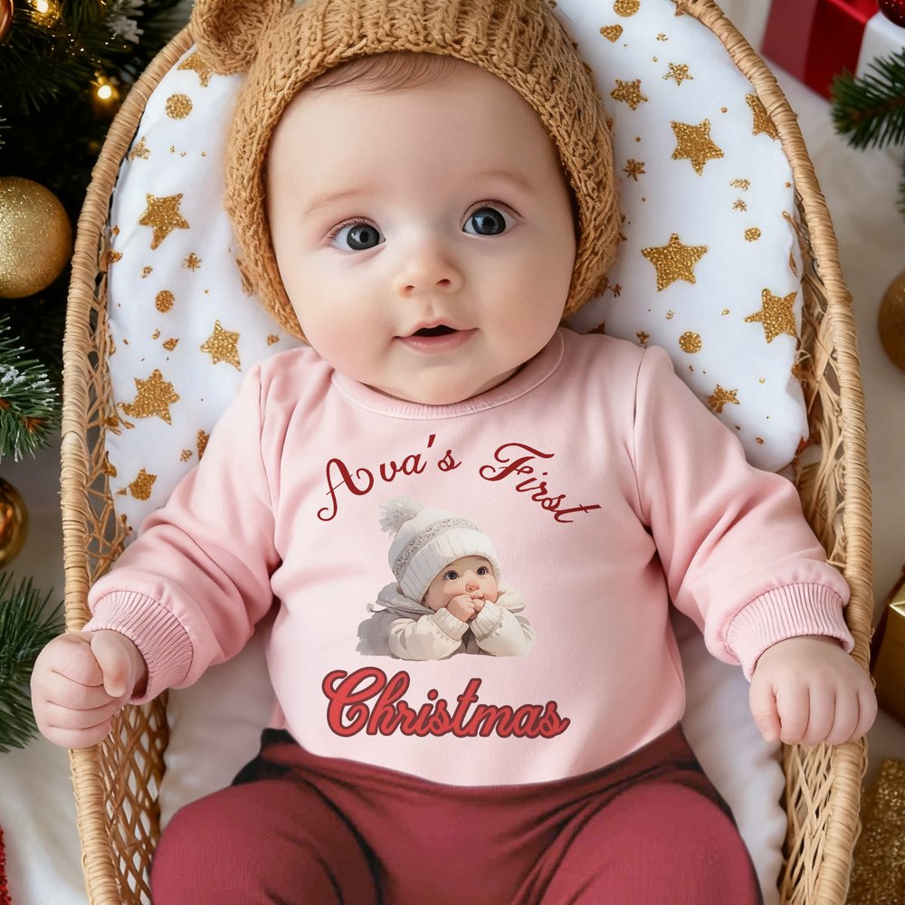This baby bodysuit features a custom name, cute Christmas baby graphic, and “First Christmas 2025” text. It blends festive design with personalization, making it an exclusive keepsake for your baby’s first Christmas.
