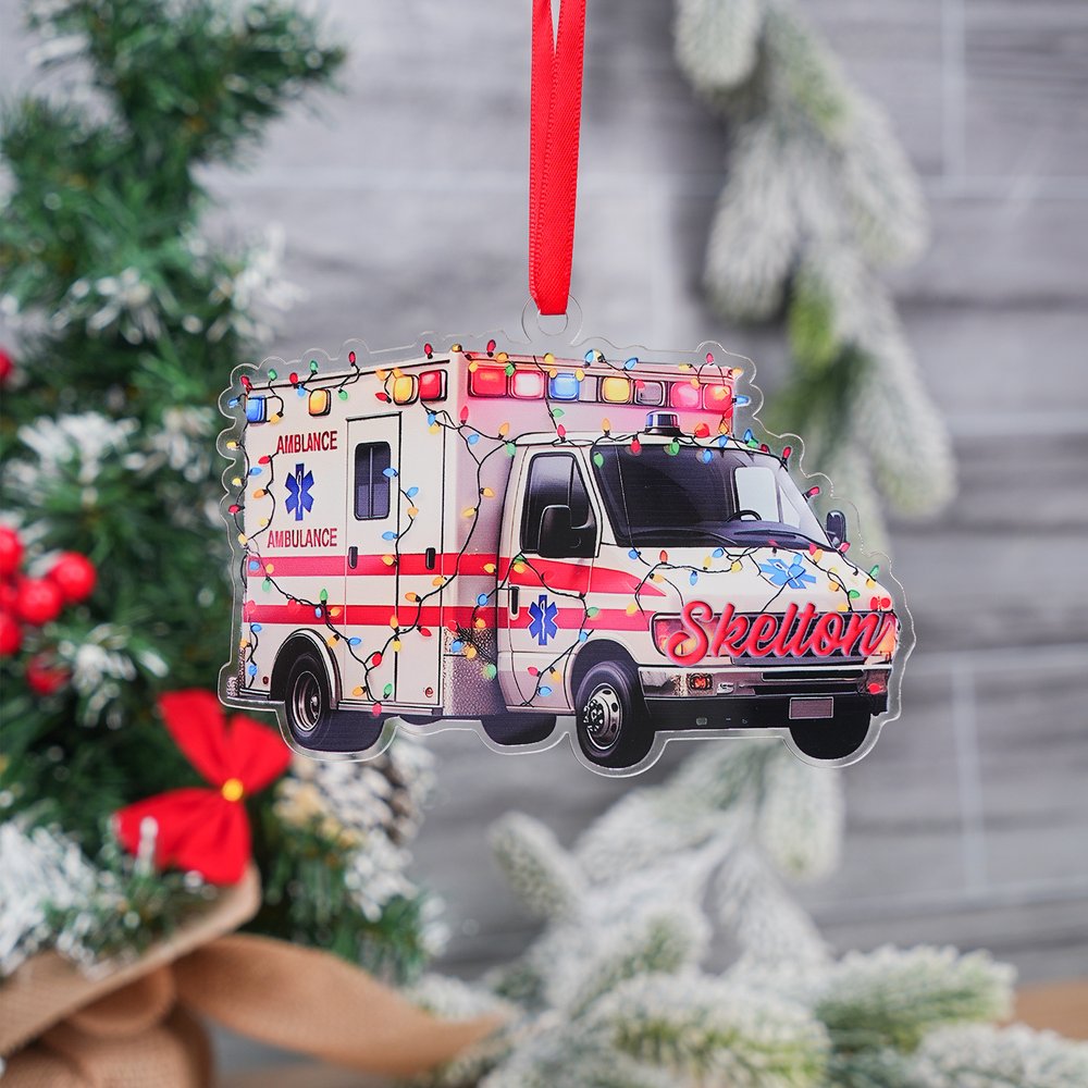 Based on an ambulance design, this design incorporates Christmas lights. The red and white ambulance features a blue medical logo, and the front can be customized with your name, ensuring professional recognition while adding a festive touch.