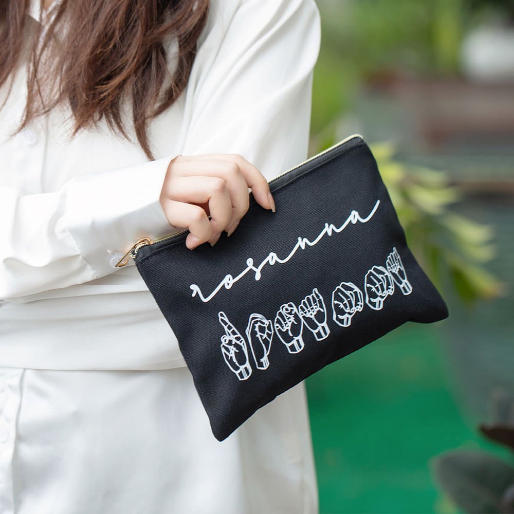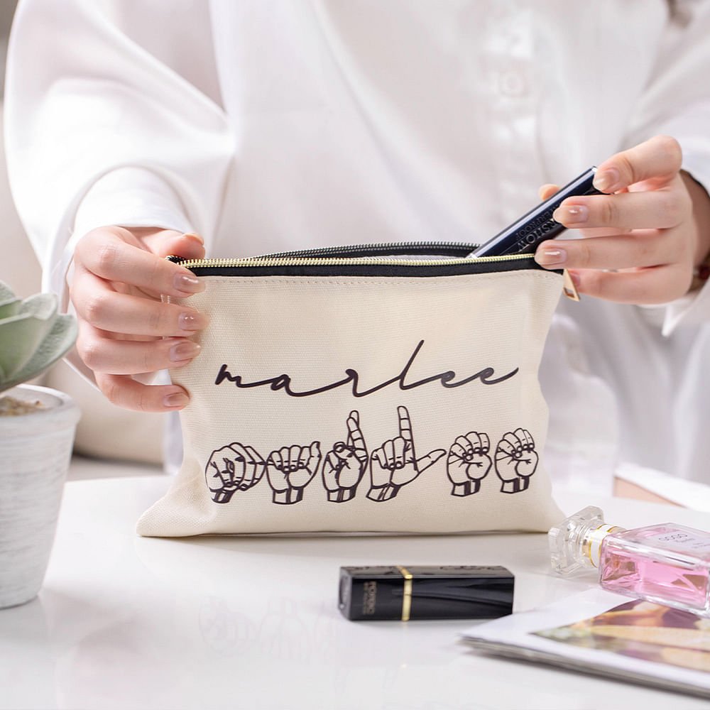 Inspired by the expressive and intricate gestures that American Sign Language (ASL) embodies, this makeup bag pays homage to the art of silent conversation. The product incorporates customizable ASL elements, promoting inclusivity and increasing awareness of the importance of sign language. You can Personalise the bag with a loved one's name, infusing it with deeper personal meaning.