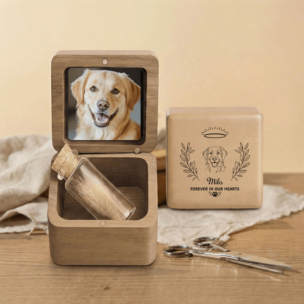 Personalised Angel Halo Photo Pet Fur Keepsake Bottle Wooden Magnetic Box Set with Name and Text Pet Loss Memorial Gift for Pet Owners
