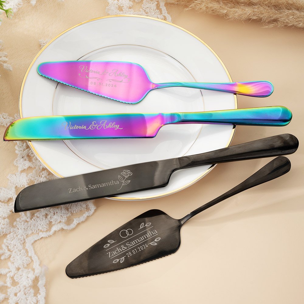 What sets this cake cutting set apart is the opportunity to engrave the couple's names and date on the surface. This personalization adds a heartfelt touch and transforms the set into a cherished keepsake that will forever commemorate their special day. Every time they use this set to cut their anniversary cake or celebrate milestones, it will serve as a reminder of their love and commitment.