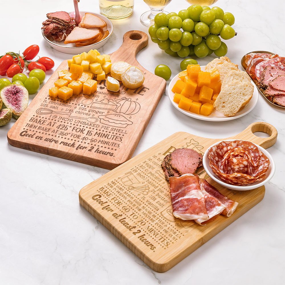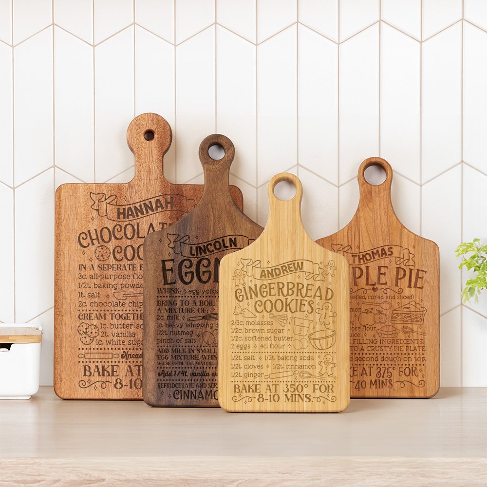 This cutting board features a selection of 9 delightful recipes, including apple pie, chocolate chip Biscuits, hot cocoa, etc. Personalise it with your own title text, making it a unique addition to your winter kitchen. The cutting board retains the natural color and texture of wood, walnut, bamboo, gaboon mahogany (okoume), and cherry wood—four different materials and colors to enrich your choice.