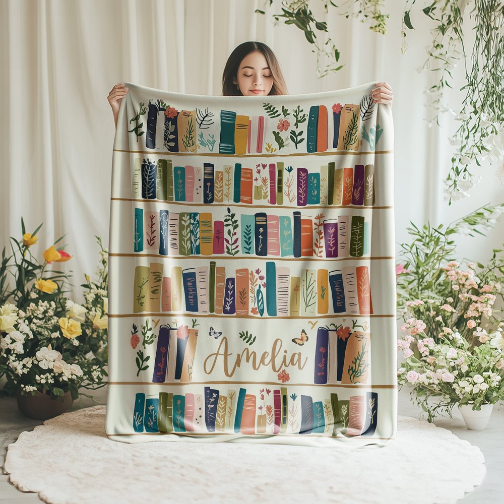 Featuring a colorful retro bookshelf as the core design, the bookshelf is filled with books adorned with plants and flowers, creating a vibrant and natural feel. Customizable names are available, transforming an ordinary blanket into a unique "bookish symbol" for book lovers.