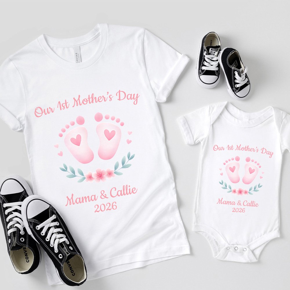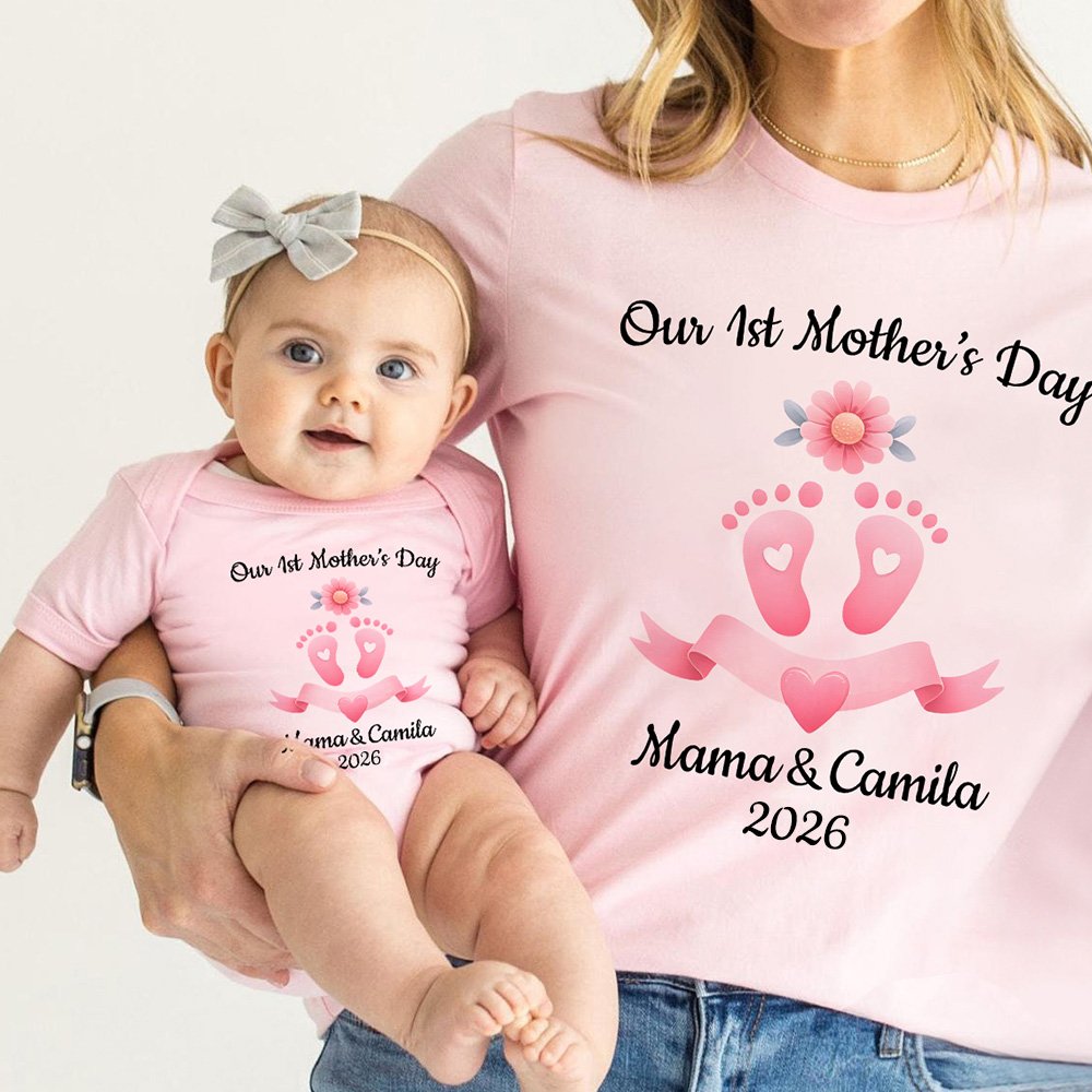 This heartfelt T-shirt and baby bodysuit showcase a charming baby footprint design. Featuring “Our 1st Mother's Day,” it beautifully commemorates this milestone with customizable mom and baby names and the baby's birth year, creating a treasured keepsake.