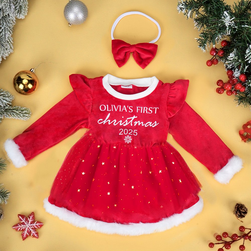 This charming dress features a vibrant red color and a delicate red bow headband. The cuffs and hem are detailed with fuzzy details, and the bottom tulle is embellished with shimmering star sequins. It perfectly matches the Christmas theme and exudes festive spirit. You can even customize it with your baby's name and year to celebrate their first Christmas.