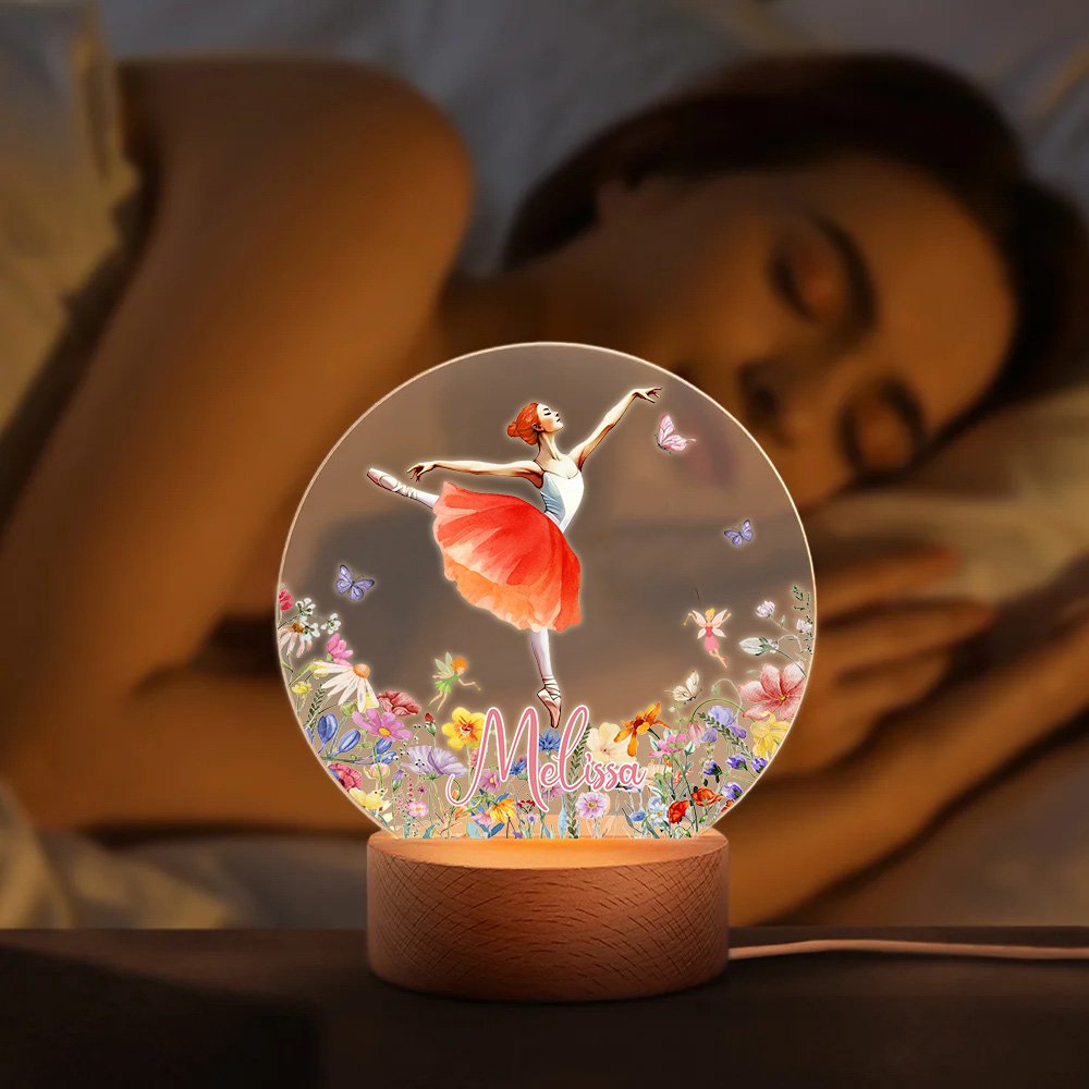 The front of this night light showcases an elegant ballet dancer in motion, with a birth flower delicately designed as the hem of her skirt. The scene is beautifully complemented by surrounding butterflies and floral patterns, creating a visually striking and charming design. Additionally, the night light can be Personalised with a custom name, transforming it into a unique and fashionable accessory that reflects your style.