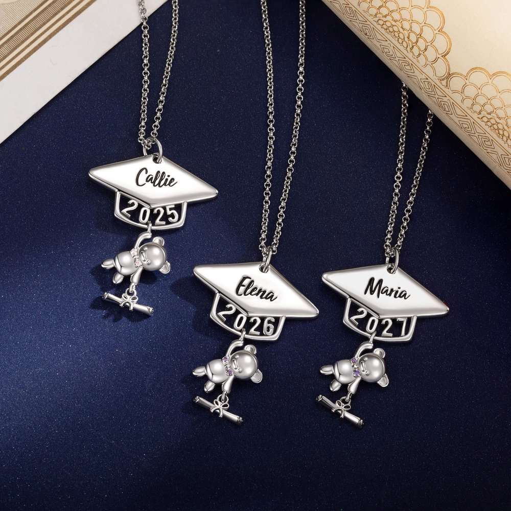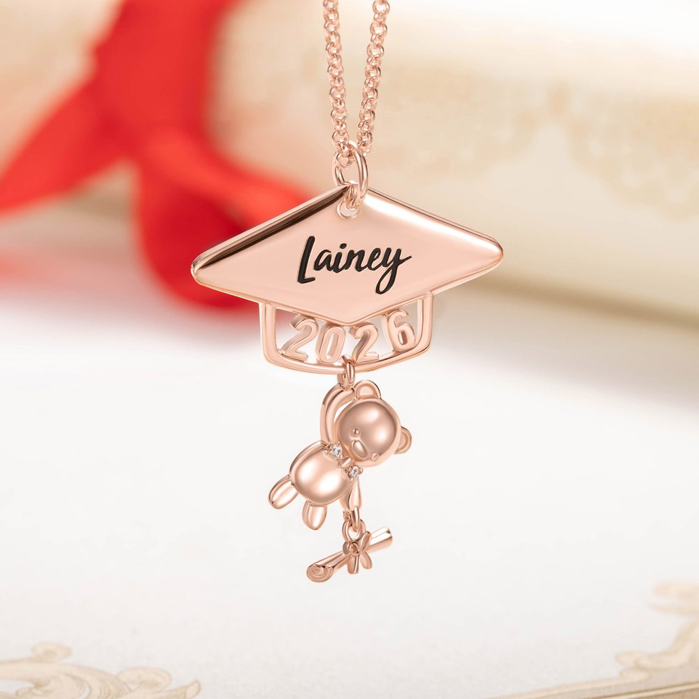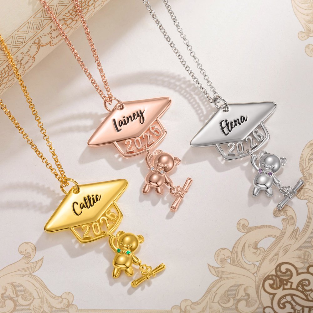 Mark the significant milestones of growth and transition with our adorable bear graduation necklace! Featuring a charming bear hanging beneath a graduation cap, excitedly cheering with a raised paw, this necklace makes it truly unique by adding the graduate's name, year and birthstone; it is the perfect way to celebrate someoneโs special graduation.
