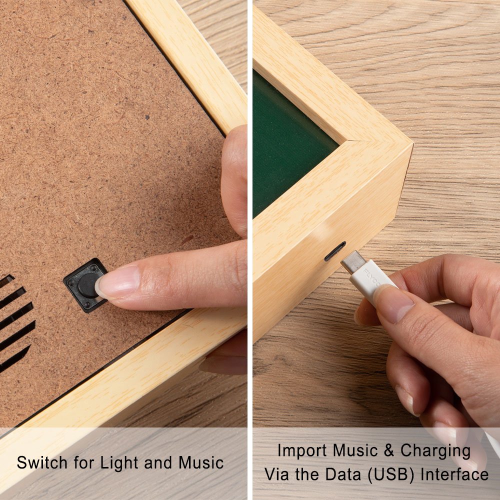 The Christmas music photo frame comes with a charging and data cable, users can access the computer to change the song according to needs. The rotary movement is powered by a battery of AA-size (the product does not come with a battery), and the light music movement is a rechargeable movement, which can be connected to the type-c charging port for charging.