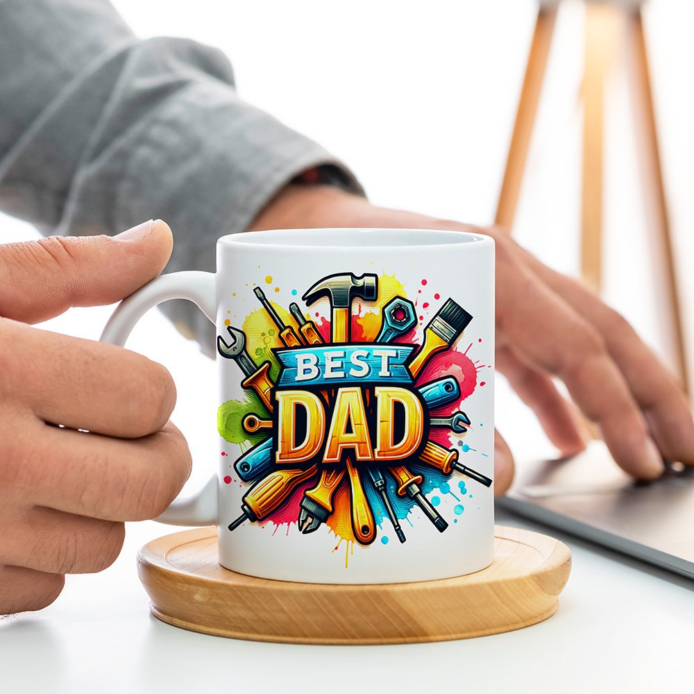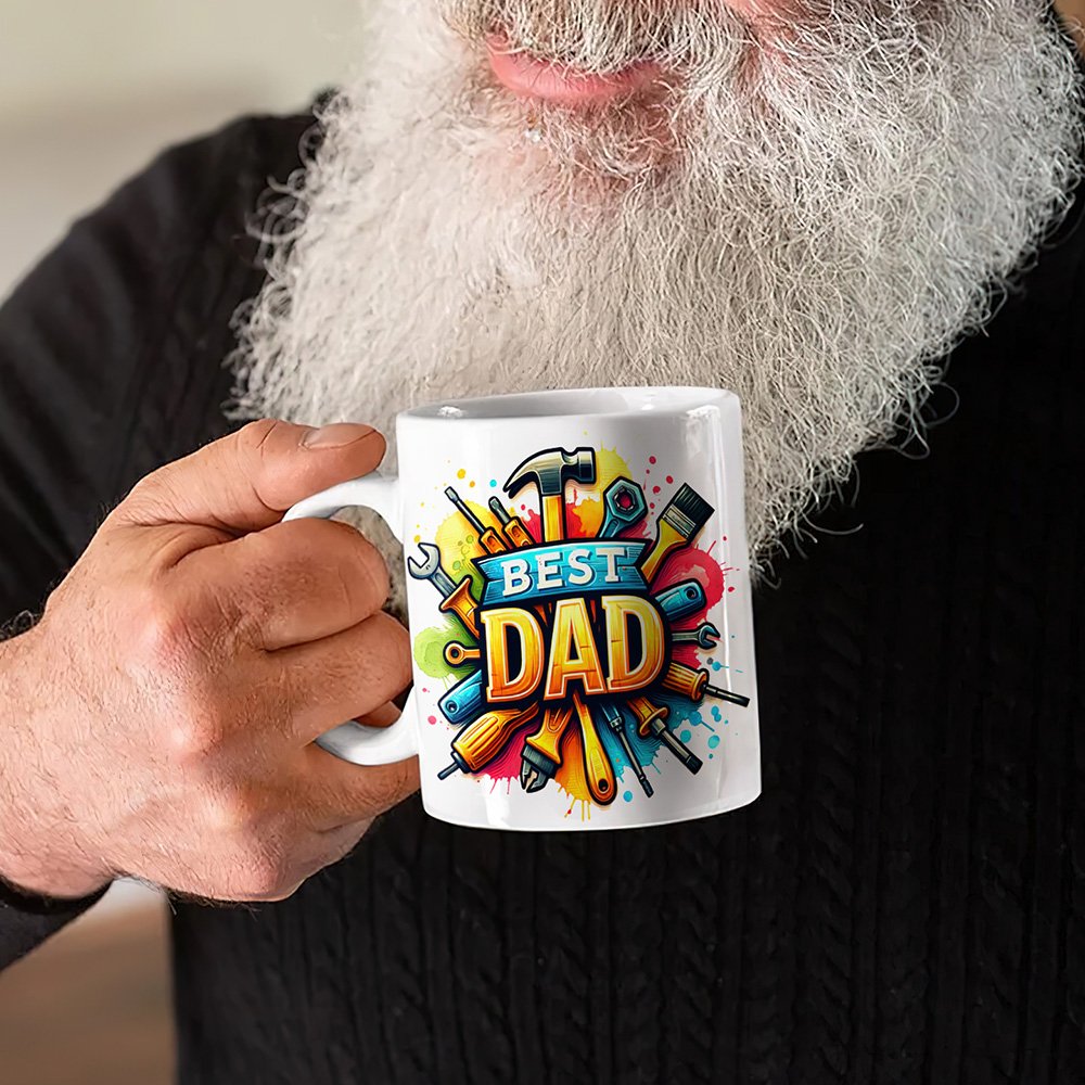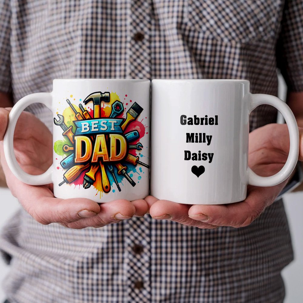 The front of the mug features a vibrant array of repair tools, such as hammers, Spanneres, and screwdrivers, all surrounding the bold "Best Dad" text. It is perfectly captures your dad's role as the family's go-to problem-solver and handyman. The back side of the mug can customize 1 to 8 of your children's names, accompanied by a heart symbol that serves as a constant reminder of the unbreakable bond between your dad and his beloved family.