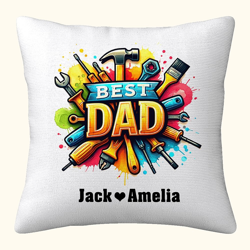 The throw pillow cover features a distinctive repair tool pattern surrounding the words "Best Dad," You can customize it with the names of up to 8 kids, sincerely showcasing the bond between father and children, making it a cherished keepsake for years to come.