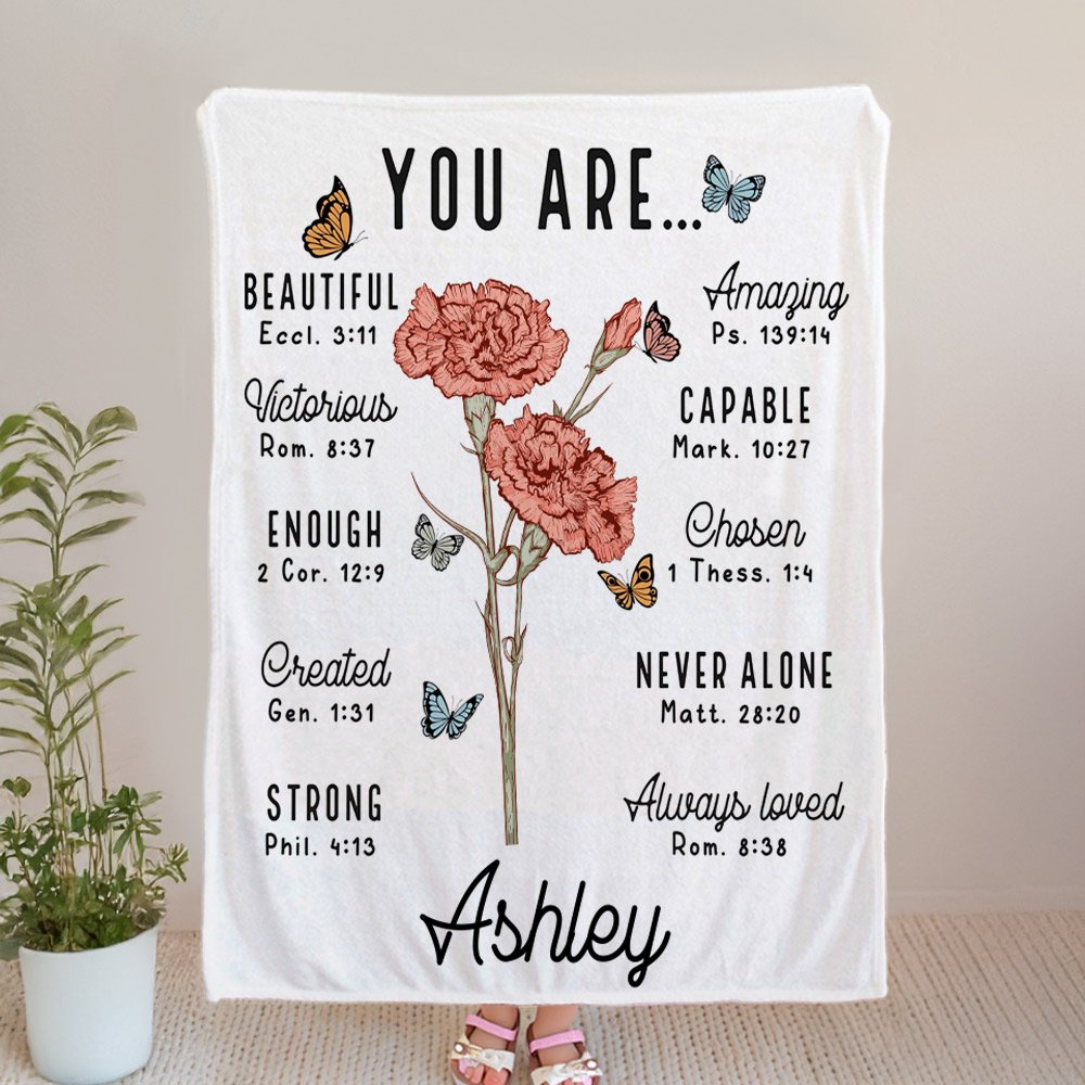 Combining exquisite design with deep religious significance, this blanket is a unique gift. The blanket features a beautiful birthday flower pattern and classic verses from the Bible, symbolizing the power of blessing and faith. You can also customize your name to make it a unique keepsake for the recipient.
