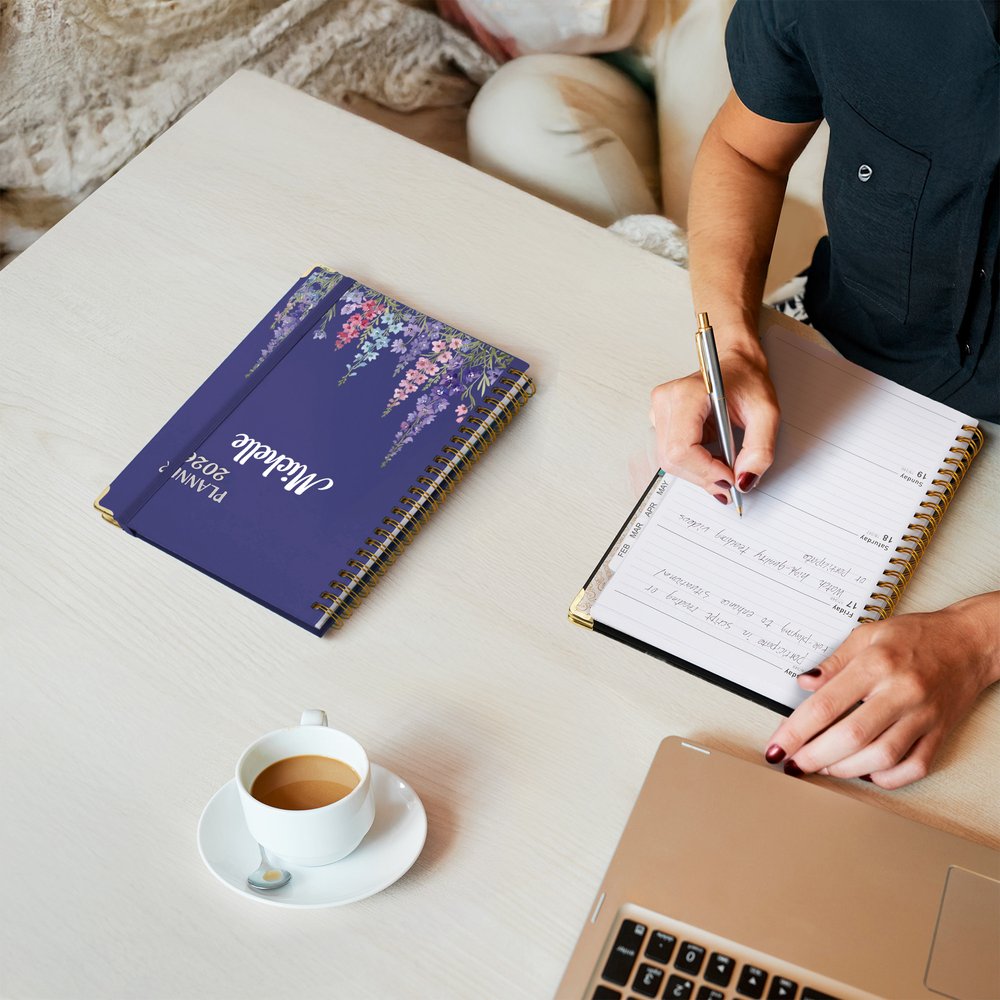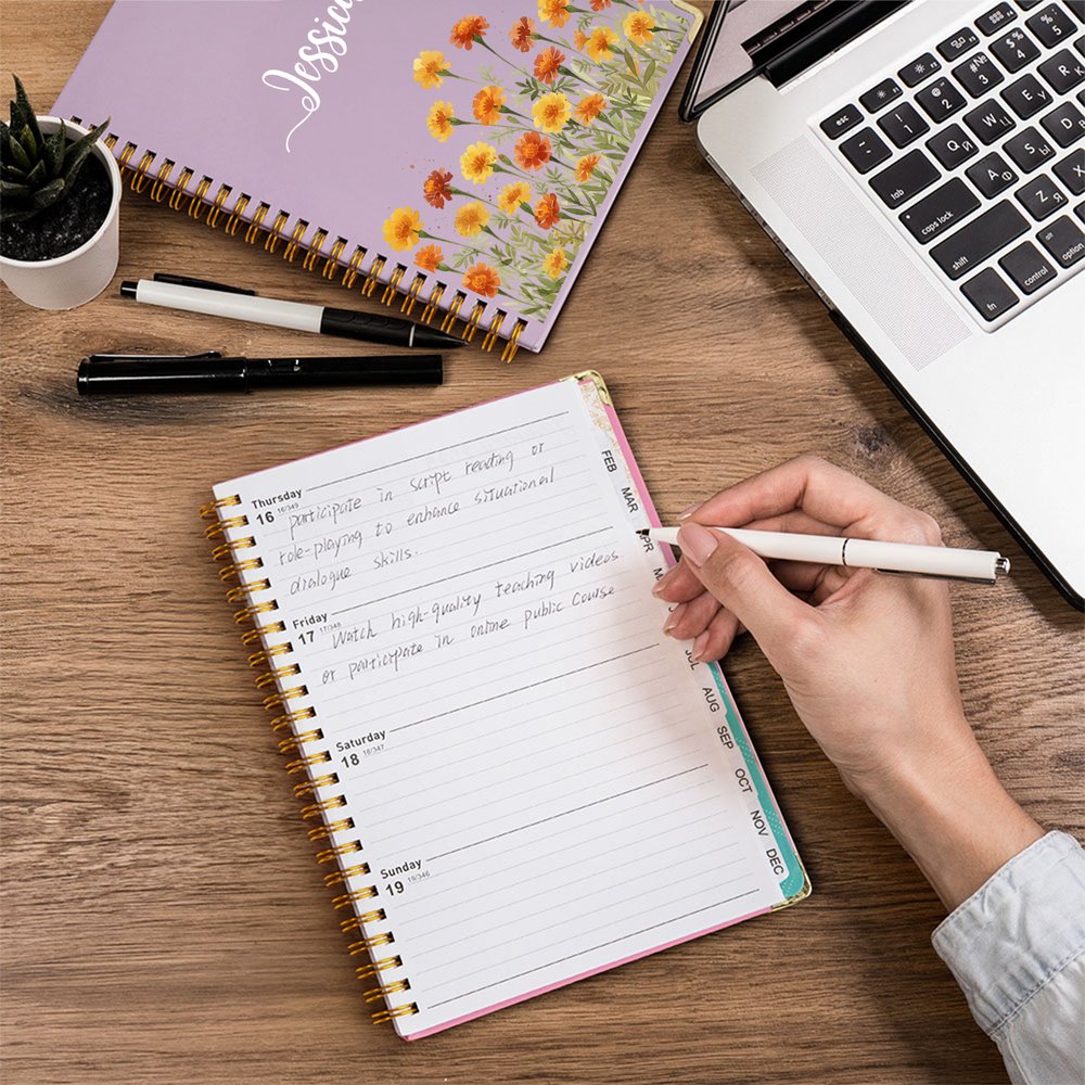 The cover is adorned with watercolor-style birth flowers and features a customized name. The hardcover is simple and elegant, with a sleek metal spiral binding that blends natural beauty with personal memories. It serves as both a planning tool and a tasteful desktop decoration.