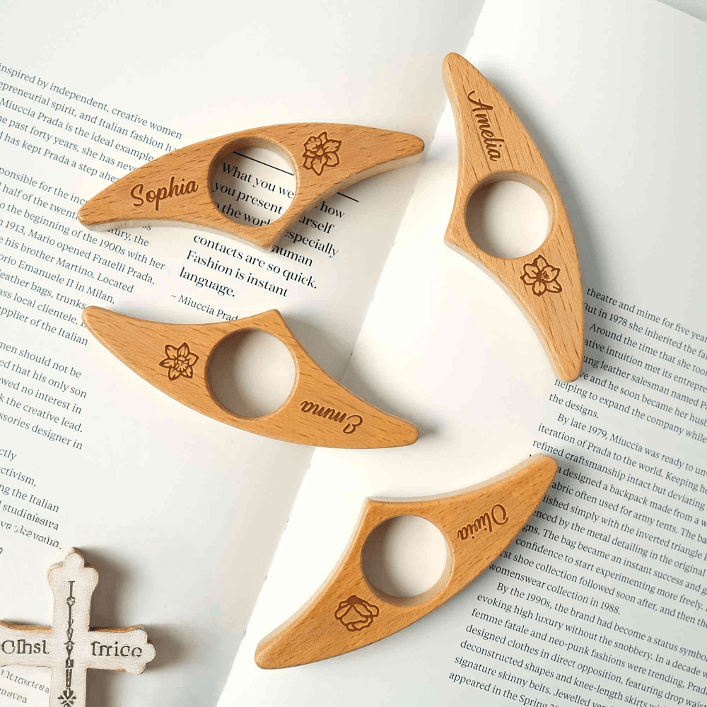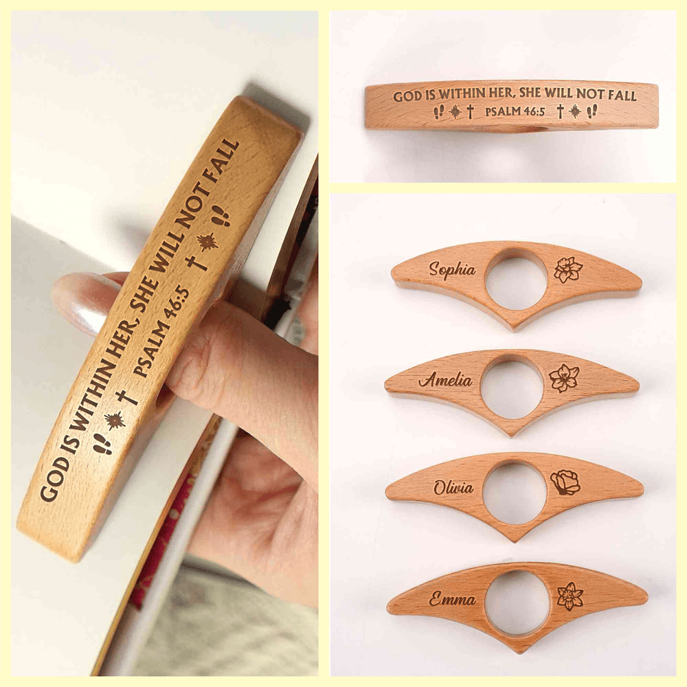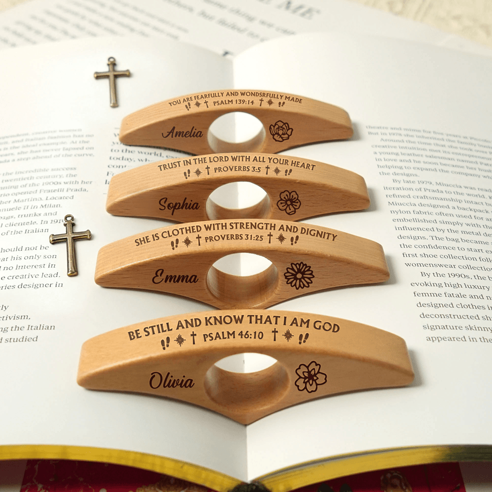 This birth flower book page holder features customizable details—including engraved Bible verses, names, text, and small motifs. Its ergonomic, curved design lets you hold pages single-handedly, turning a functional tool into a Personalised, faith-aligned accessory for readers.