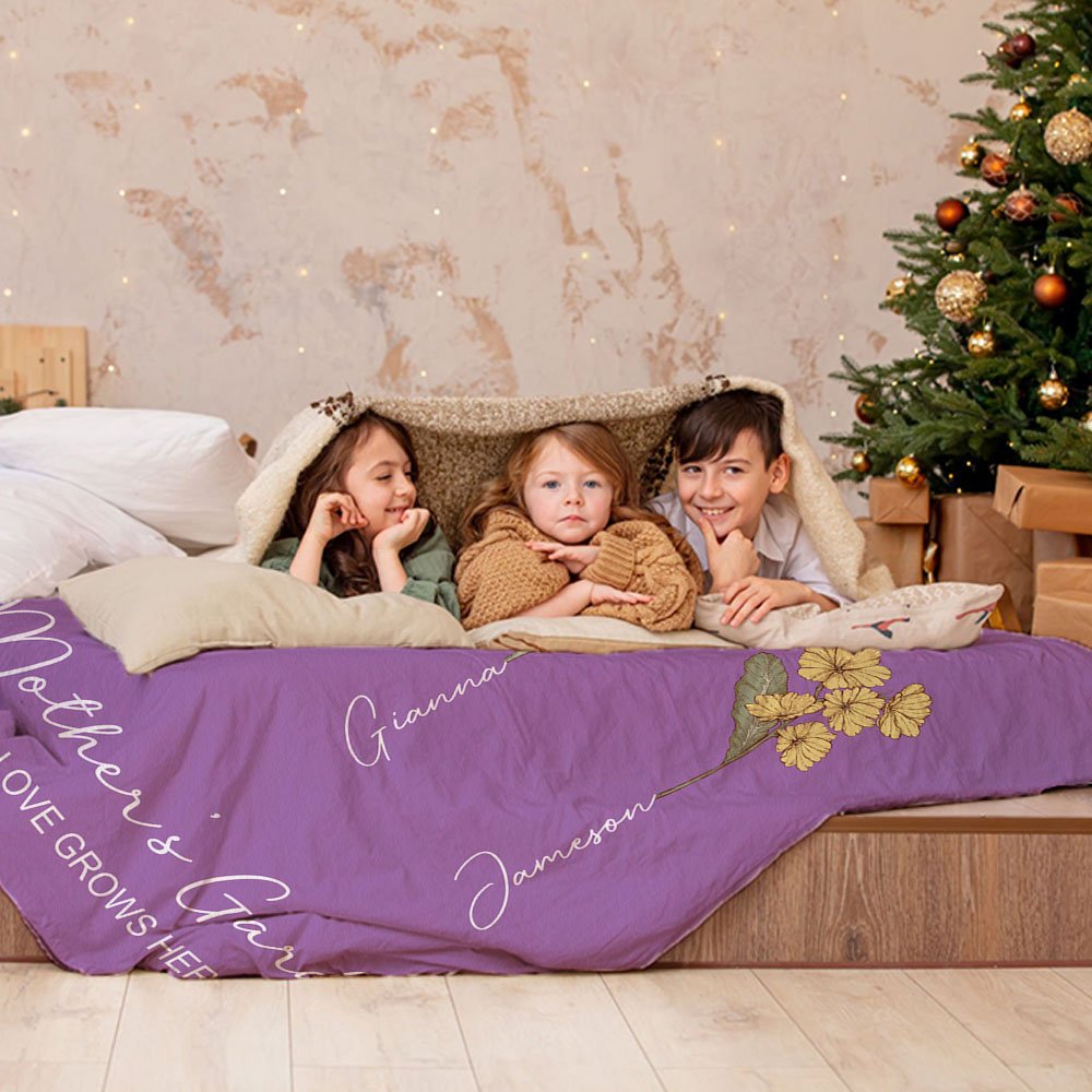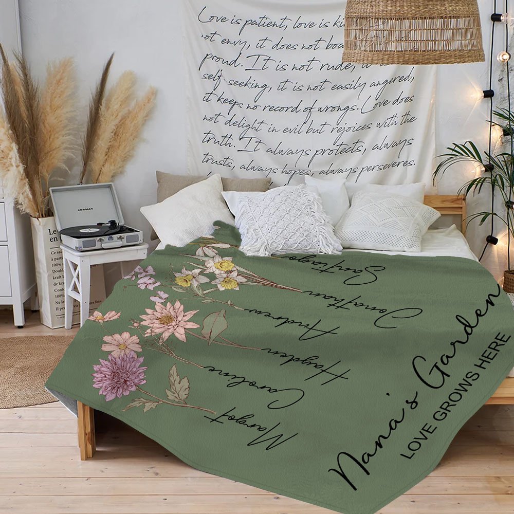 This blanket showcases a mesmerizing watercolor floral print, highlighting the recipient's birth flower. Each bloom symbolizes the unique qualities associated with the birth month, creating an intimate and cherished connection. The tender phrase "Love Grows Here" adds an endearing touch, making this blanket not just a decoration but a heartfelt expression of love and warmth.