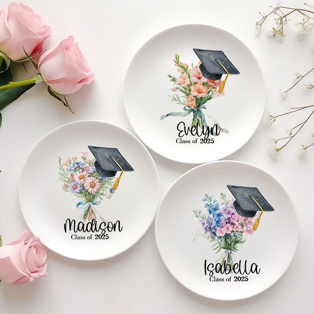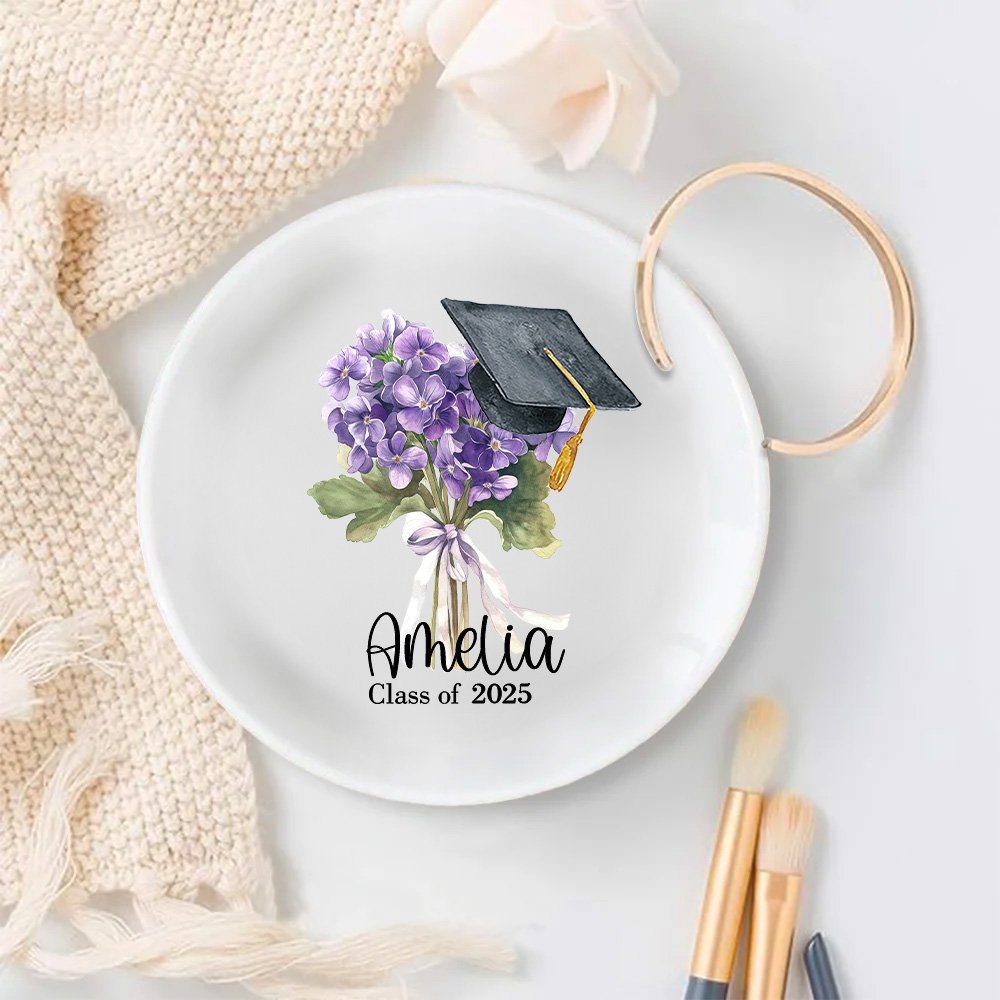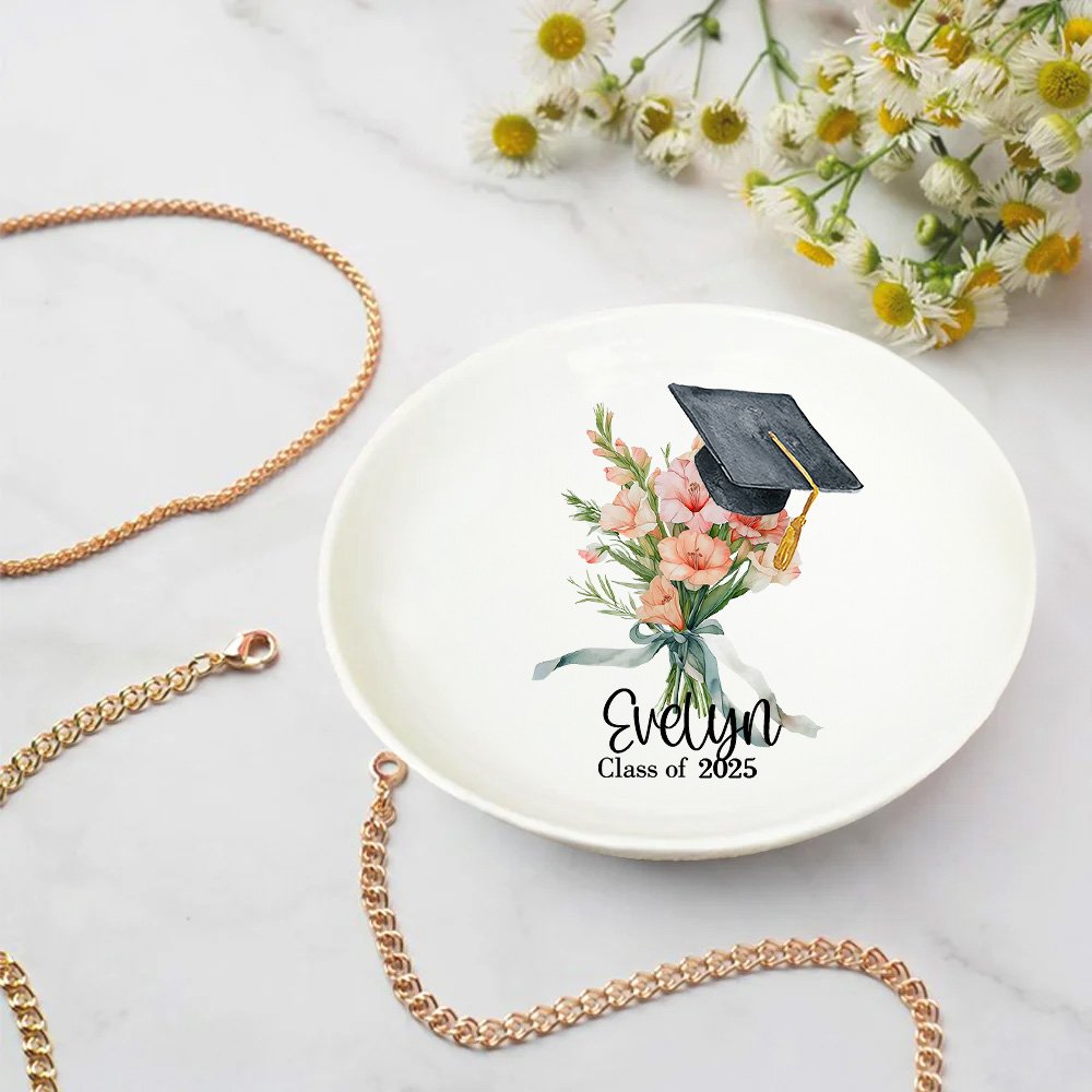 This jewellery dish features a watercolor birth flower bouquet and a graduation cap, making it a truly unique and Personalised gift. Customize it with the graduate's name and class year to create a one-of-a-kind keepsake that they'll treasure forever. It's a heartfelt way to send your best wishes and commemorate their special day.