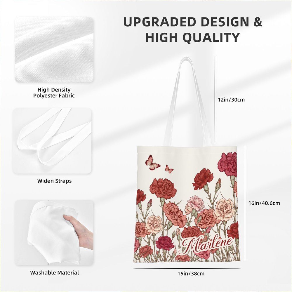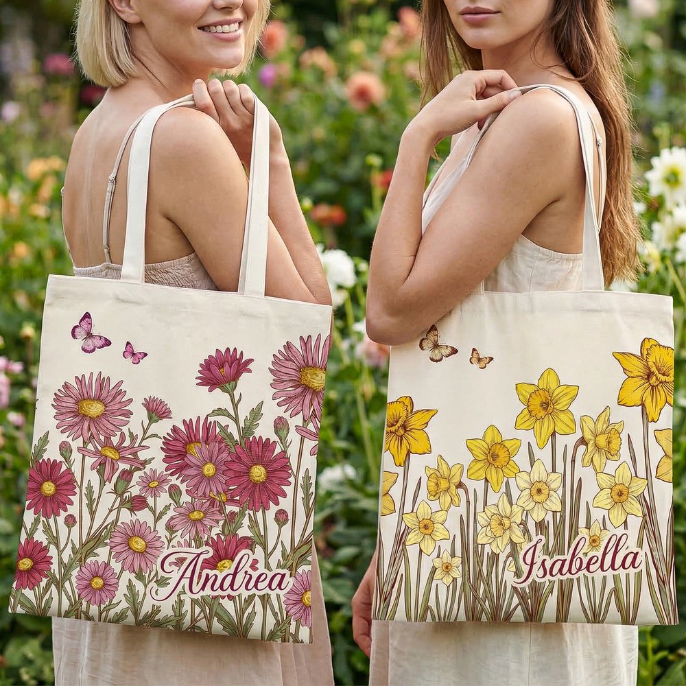 The tote bag boasts a vintage, botanical aesthetic, featuring delicate birth flower illustrations paired with whimsical butterfly accents, which creates a soft, romantic look. You can also add a custom name to create a one-of-a-kind accessory that reflects the recipient’s unique identity.