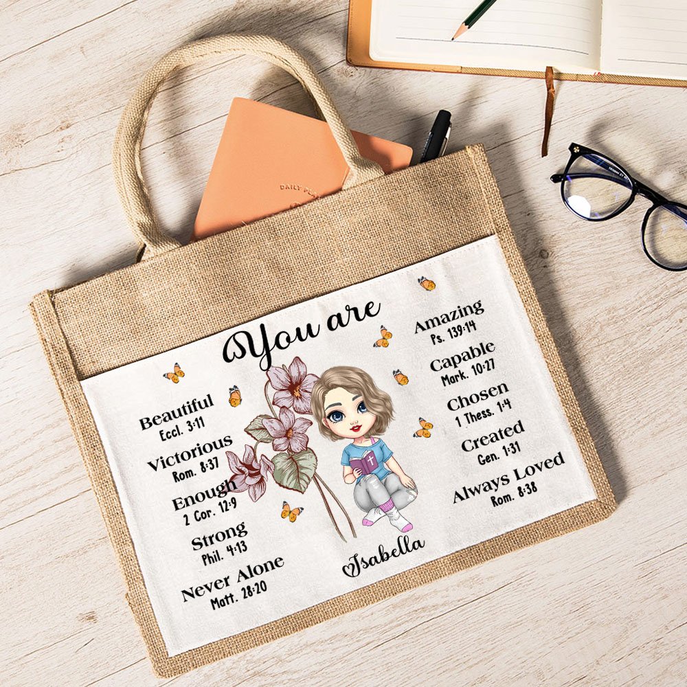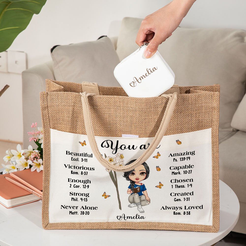 This large-capacity jute tote bag features a delightful cartoon girl illustration alongside a beautiful birthflower motif. Personalised with a name, it creates a unique and meaningful accessory. The cute character, birth flower symbolism, and personality make this bag a special item that resonates with the owner's identity and faith.