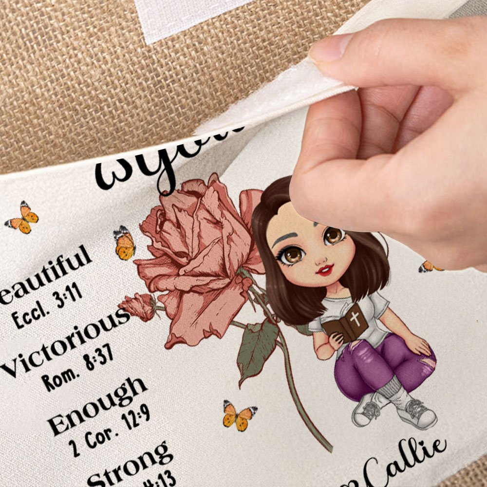 Adorned with uplifting Christian quotes, this tote is a daily reminder of faith and positivity. The inspiring messages and the cheerful cartoon girl design offer encouragement and spiritual comfort throughout the day. It's a subtle yet powerful way to carry one's faith and spread positivity daily.