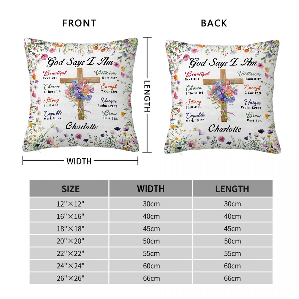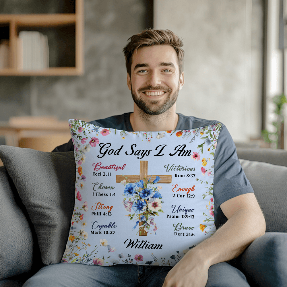 This beautifully designed pillow cover blends faith and personalization in a truly special way. It features delicate cross and floral patterns, paired with inspiring scripture, "God says I am." Each cover can be customized with a name and birth flower, creating a meaningful piece that reflects both faith and individuality.
