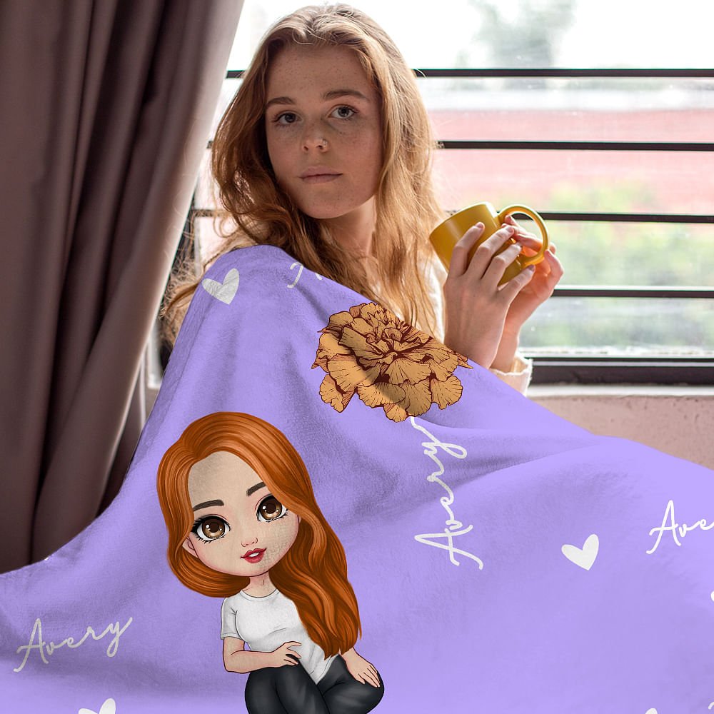This soft blanket features adorable cartoon characters and heart icons, birth flower illustrations that can be Personalised with a name, appealing to girls, boys, and adults alike.