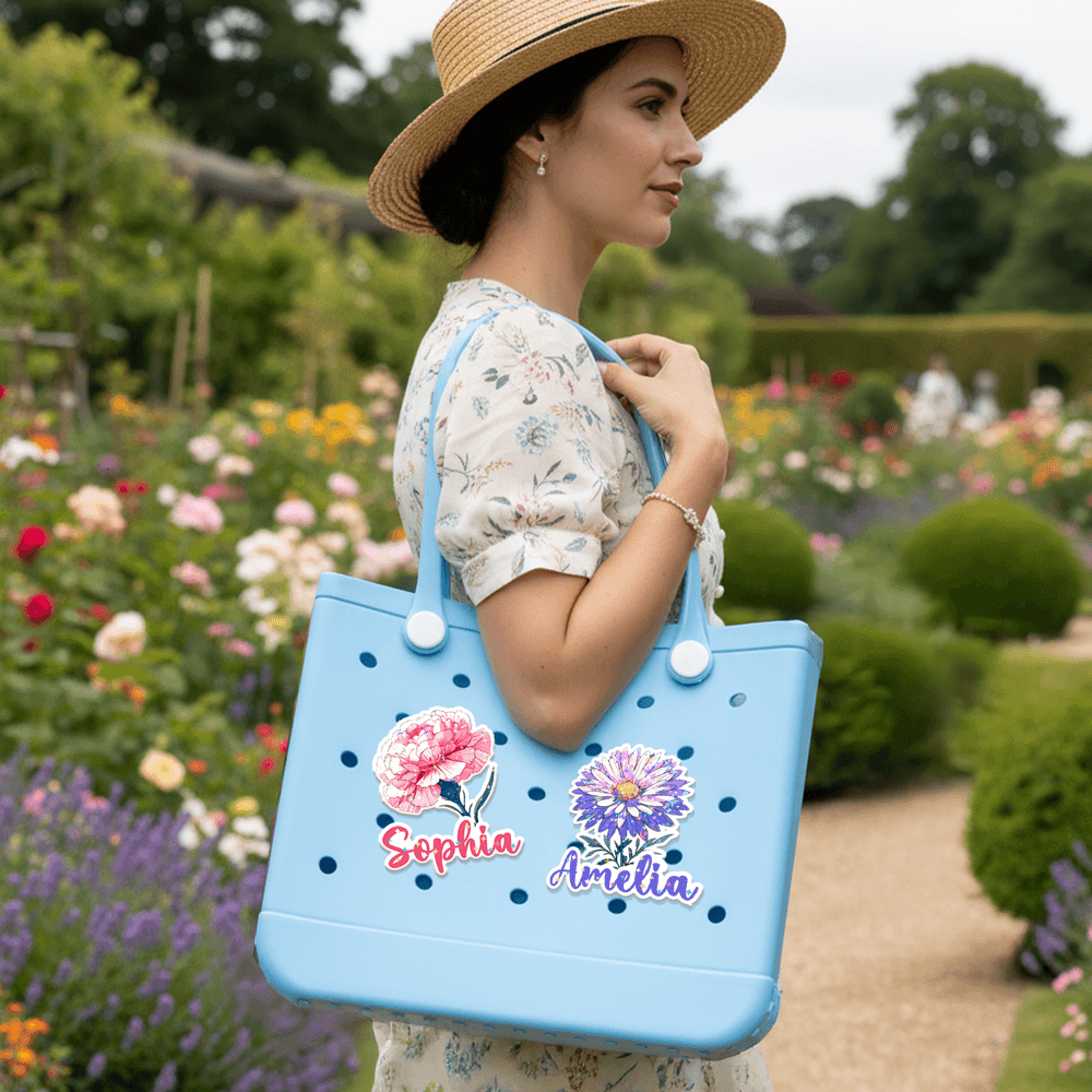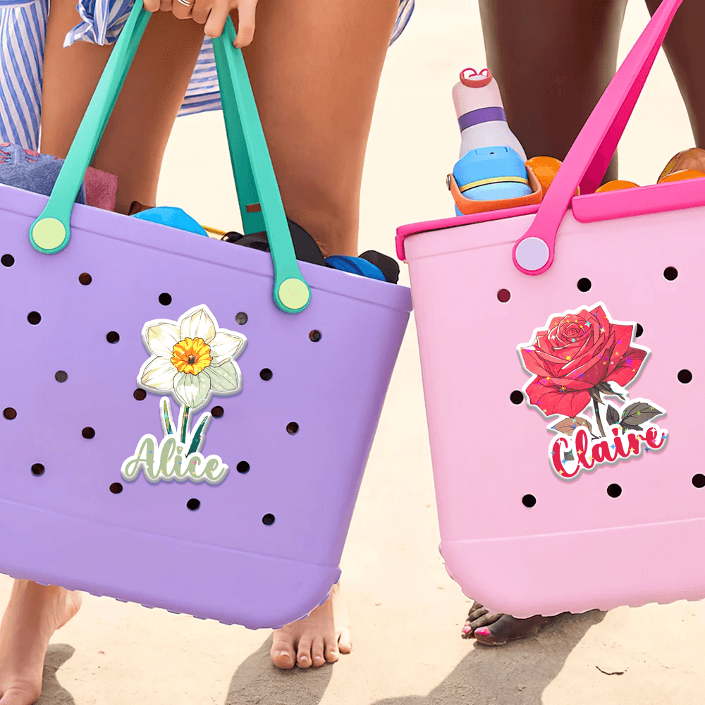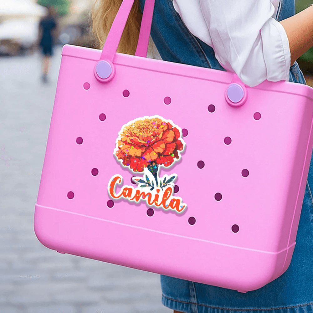 Our tag charm perfectly blends elegance and personalization. Embellished with a unique birthday flower pattern and adorned with sparkling stars, they're a charming addition to any bag. Customizable with your name, they're a heartfelt expression of personality and style, perfect for celebrating special moments and cherished memories.