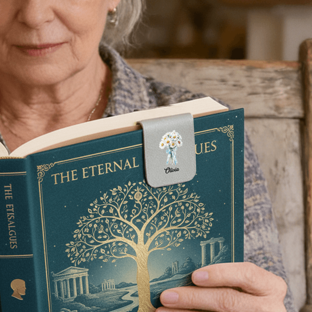 Hand‑drawn birth‑flower motifs in three styles—single bloom, bouquet, or wreath—give this magnetic PU leather bookmark a fresh, elegant look. Choose a Personalised name (two font options) and from multiple premium leather colors. The magnetic clip and corner‑friendly design add refined detail, turning each bookmark into a tasteful personal reading emblem.