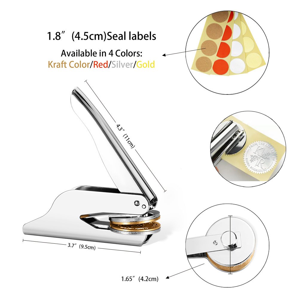 | Measurement: | Embosser Size - 3.7" x 4.3"(9.5cm Γ 11cm) Round Seal Diameter - 1.65"(4.2cm) Seal Sticker Diameter - 1.6"(4cm) |