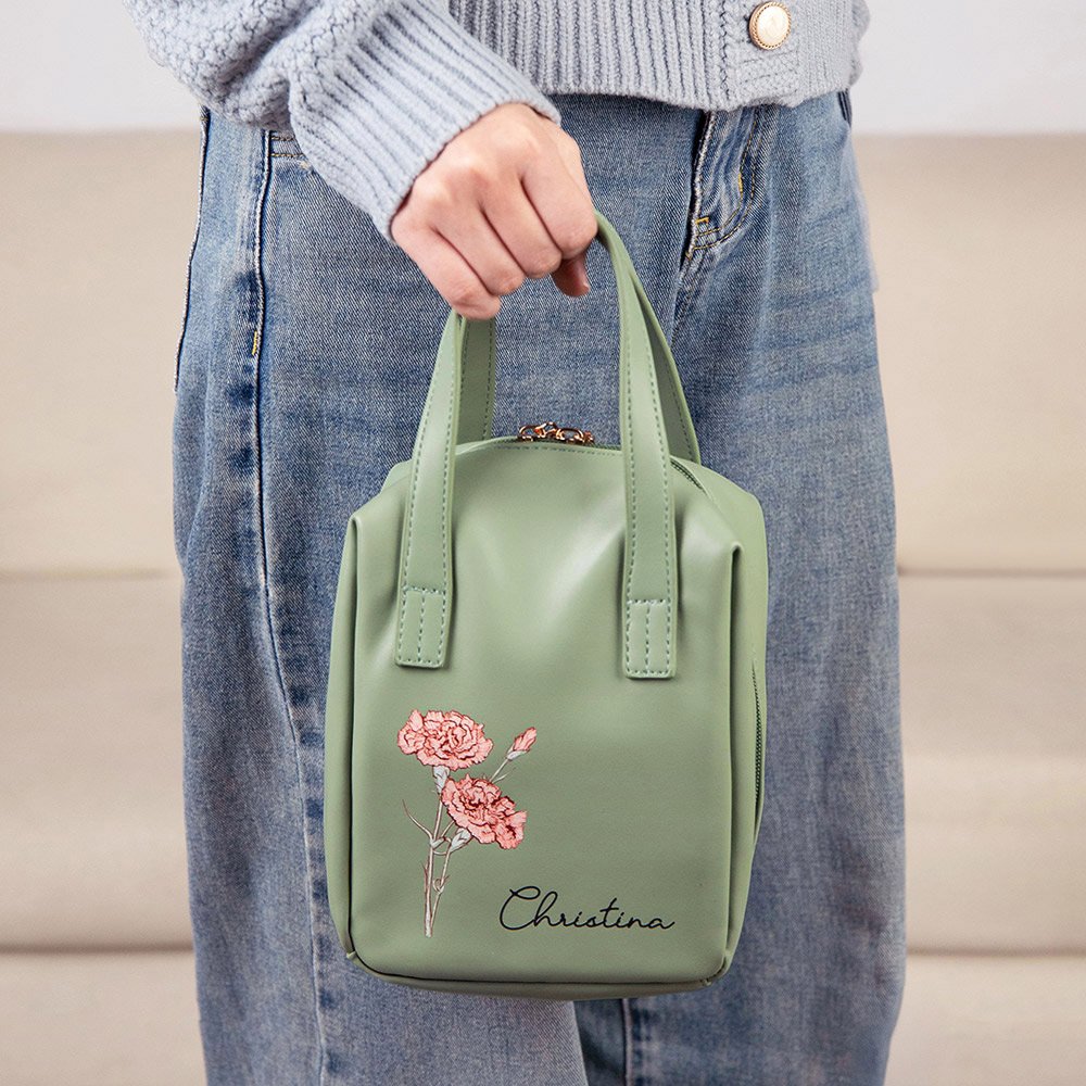 Personalised Birth Flower Name Portable PU Leather Makeup Bag with Handle and Multiple Compartments Travel Accessories Birthday Gift for Women Girls