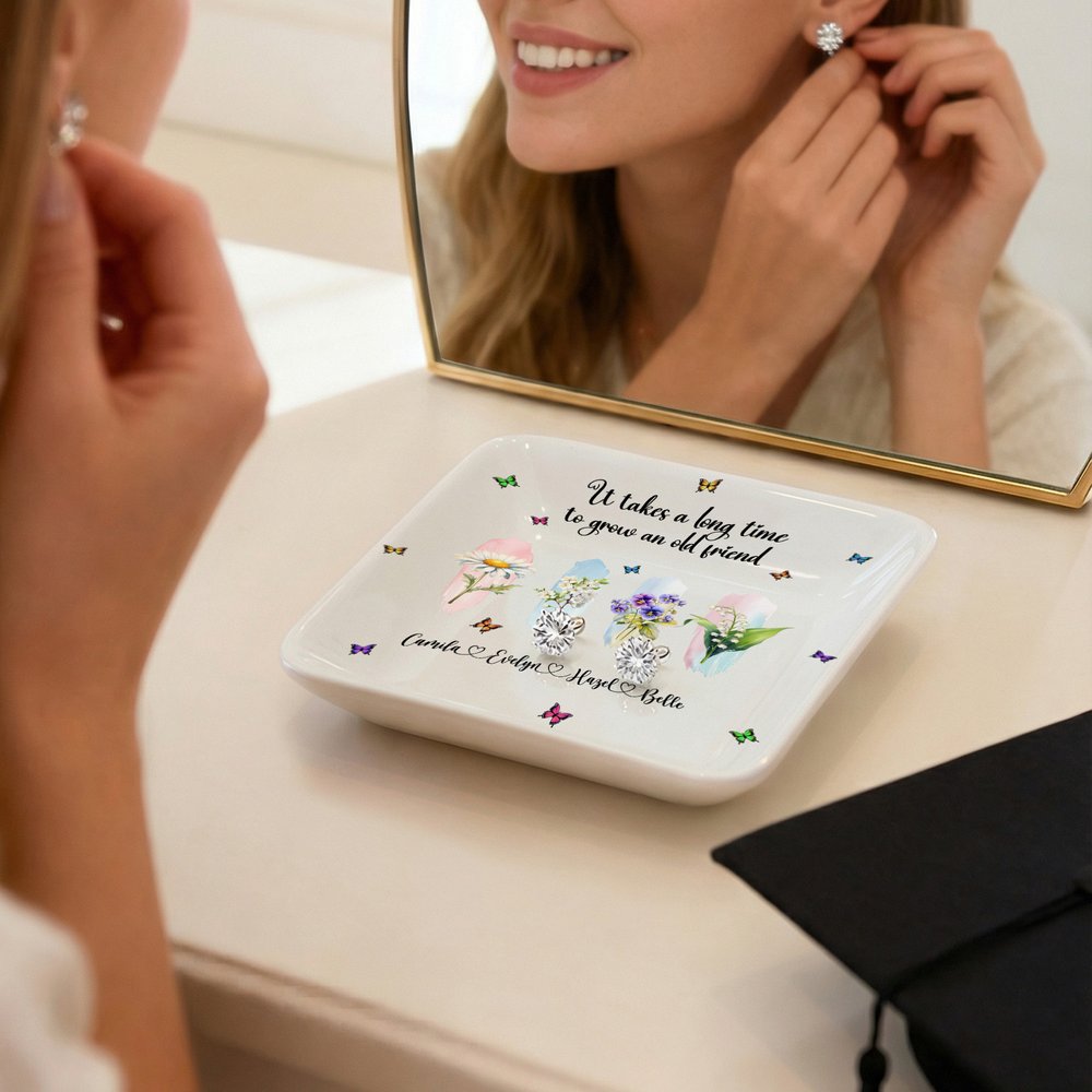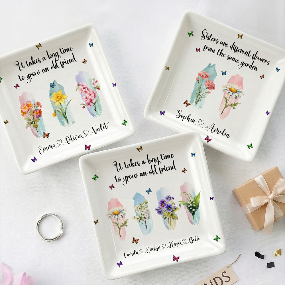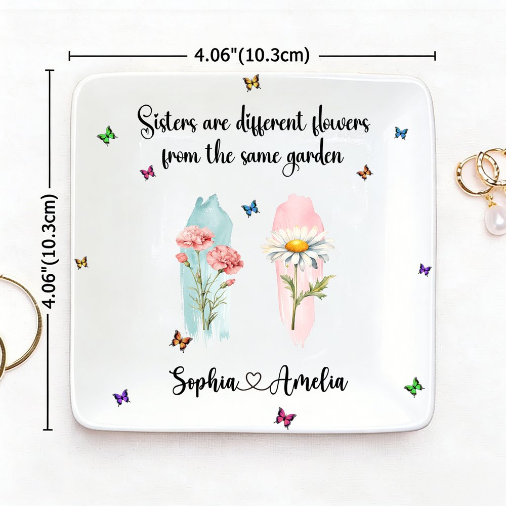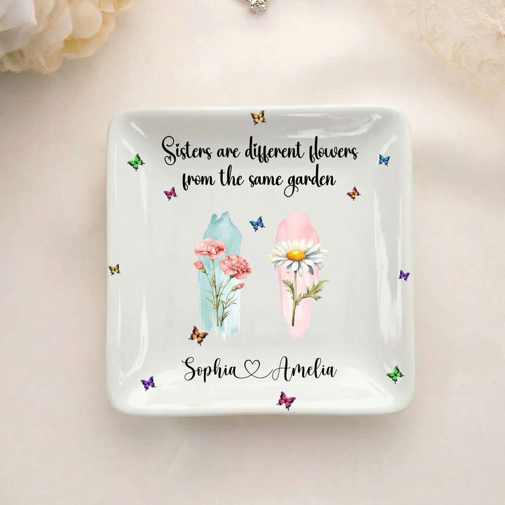 This exquisite ceramic jewellery dish features a design centreed around birth flowers and butterflies. It can also be customized with text and names, making it a unique keepsake that reflects your personality.