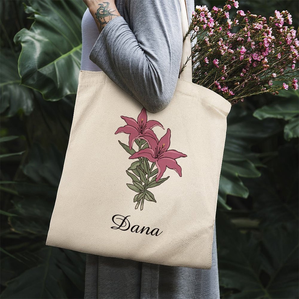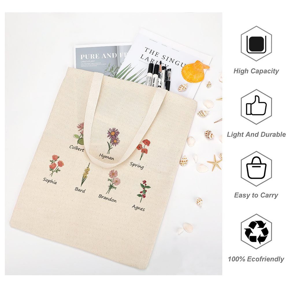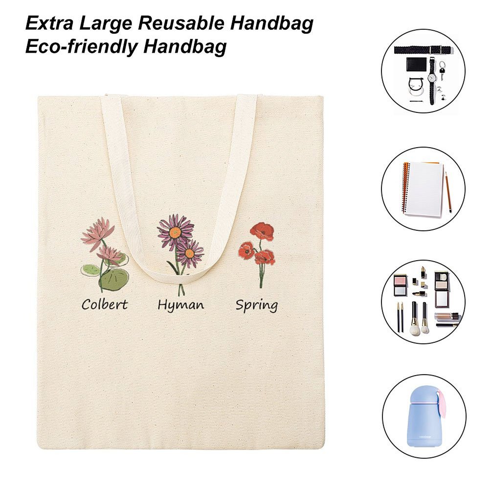 These adorable canvas tote bags feature beautiful and intricate patterns inspired by birth flowers, exuding a simple yet elegant aesthetic. Customize each bag by adding the names of your family members, symbolizing their unique presence. It makes for a perfect gift for your wife, mom, or grandma on occasions like Thanksgiving Day, Christmas, anniversaries, and more.