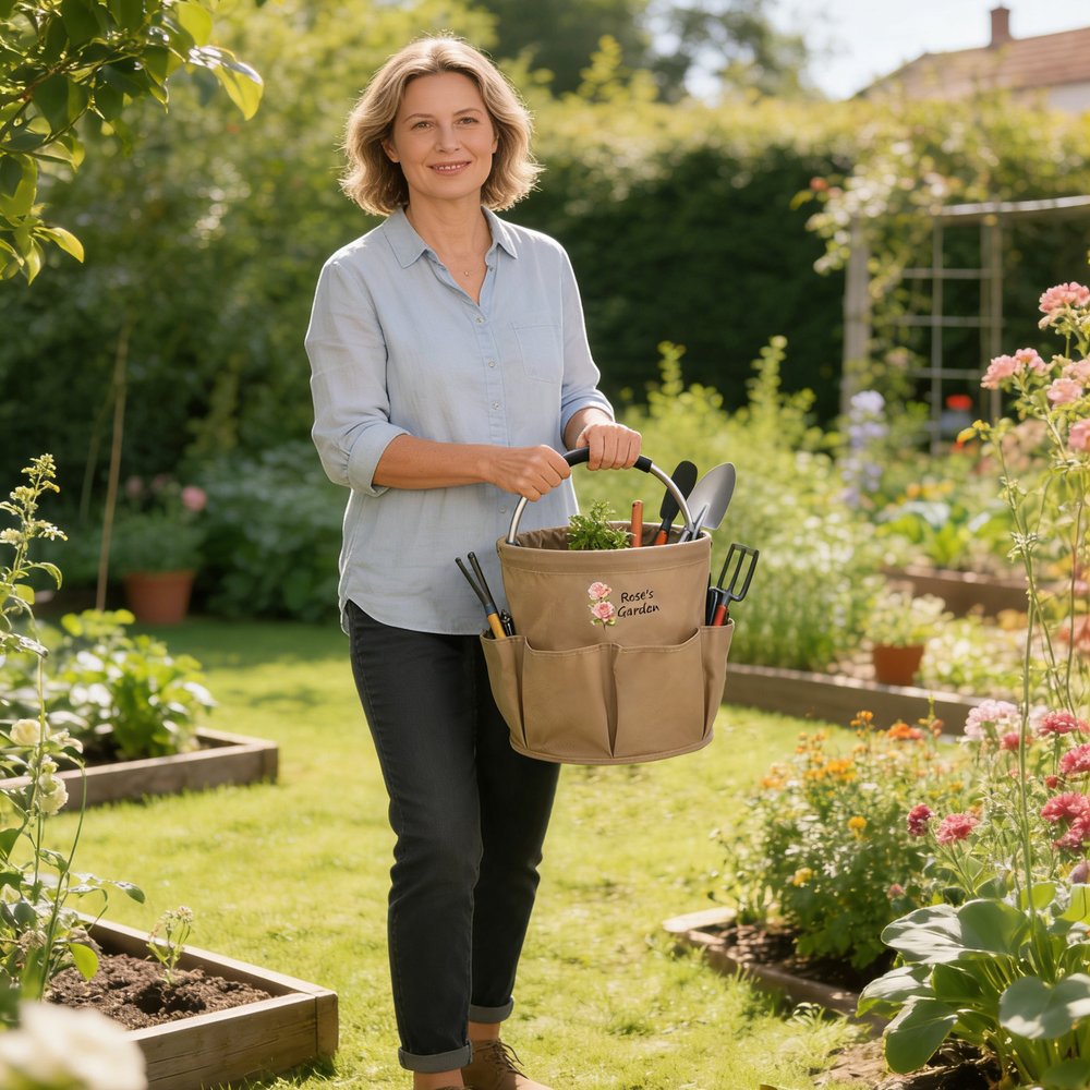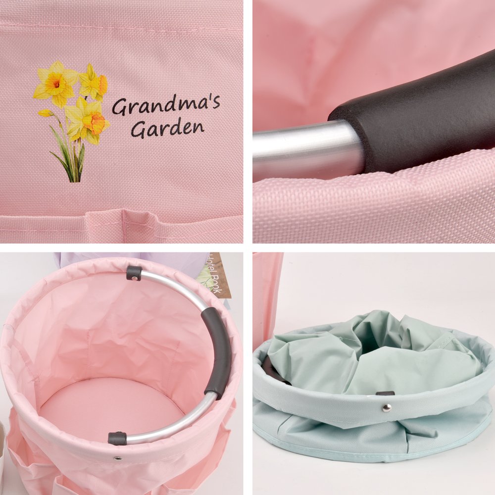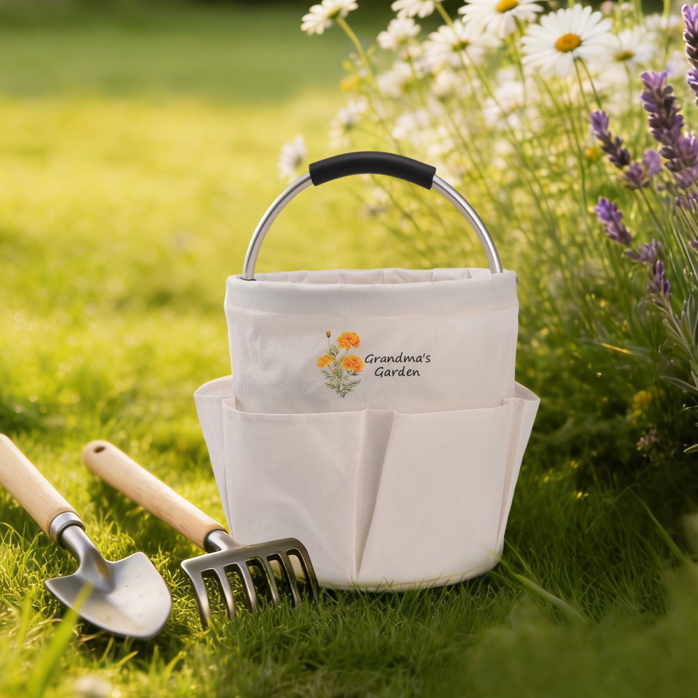 This gardening tool bag combines practicality with aesthetic appeal. Featuring a sleek bucket silhouette—fresh and timeless. The front can be customized with a name and birth flower, gently presenting "[Name]'s Garden" as a unique personal emblem. Multiple front pockets provide organized storage for trowels, rakes, scissors, and other tools, with easy access. The foldable design makes it simple to store when not in use, saving space. Thoughtfully combines style with functionality—perfect for everyday gardening needs.