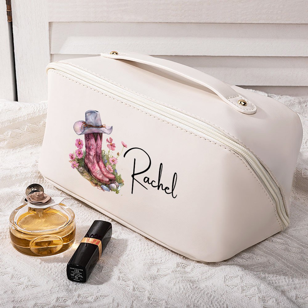 This leather makeup bag showcases a captivating design that combines the charm of cowgirl boots and a stylish hat, enhanced with Personalised birth flowers. The thoughtful layout not only highlights the unique aesthetics but also ensures functionality. Each bag can be customized with the recipient's name, adding a personal touch that transforms it into a one-of-a-kind gift.
