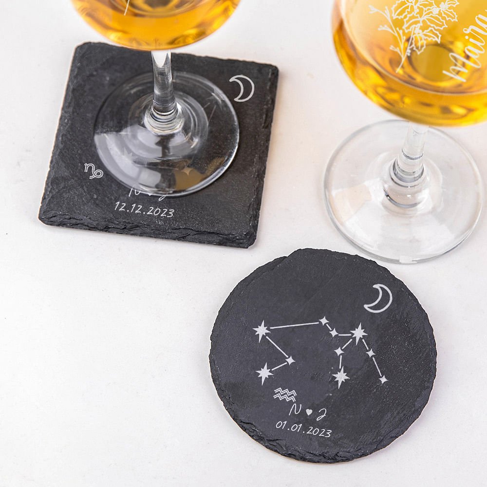 This wine glass adopts the line birth flower design. The simple style outlines the birth flower pattern, which looks more delicate and beautiful on the transparent glass. The coaster is added with the constellation design, and the white lines on the black coaster are more unique and advanced.
