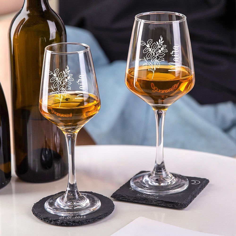You can customize your name on the wine glass and the text and date on the coaster to create a unique drinkware set.