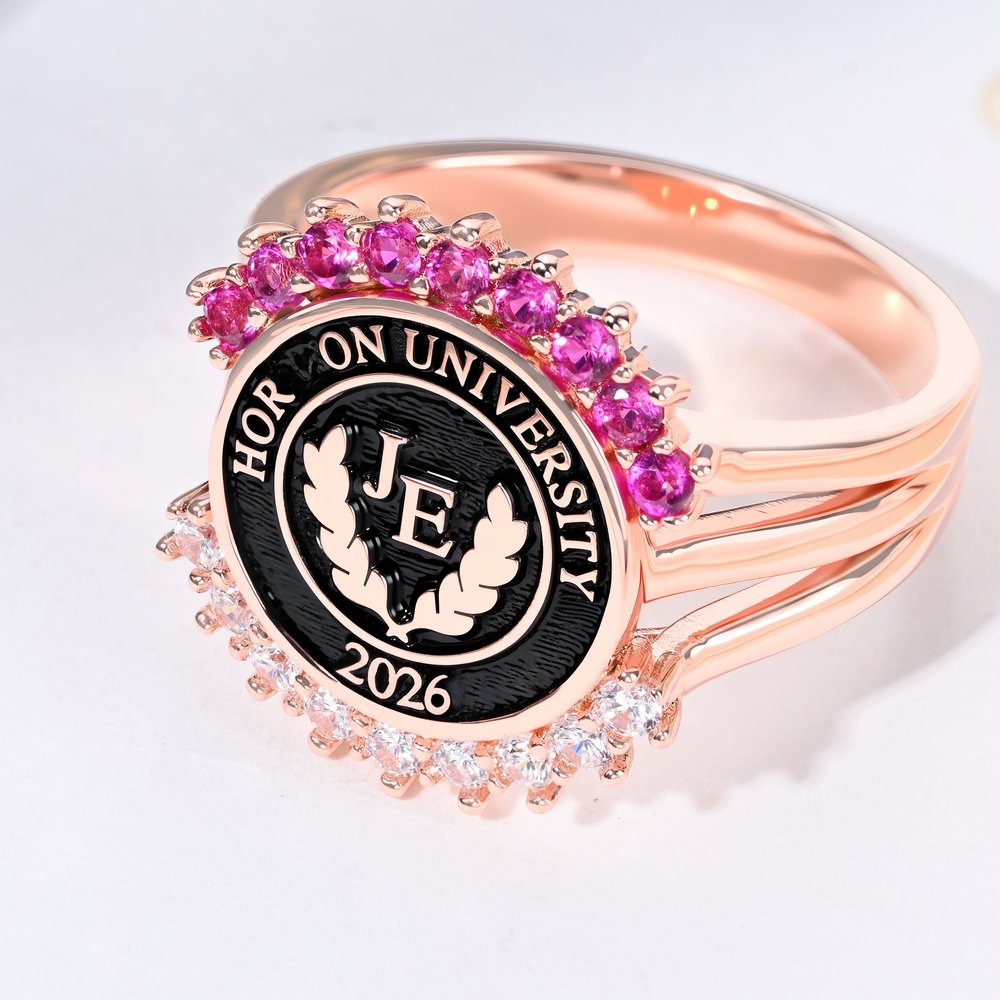 This graduation ring features customizable birthstones and fixed white diamonds set in a single line, enhancing its elegance and charm. The top allows for a Personalised touch that represents your birthday month, while the centre can be customized with text, initials, and the graduation year using a precise casting technique. This combination symbolizes your achievements, pride, and memories from your school journey.