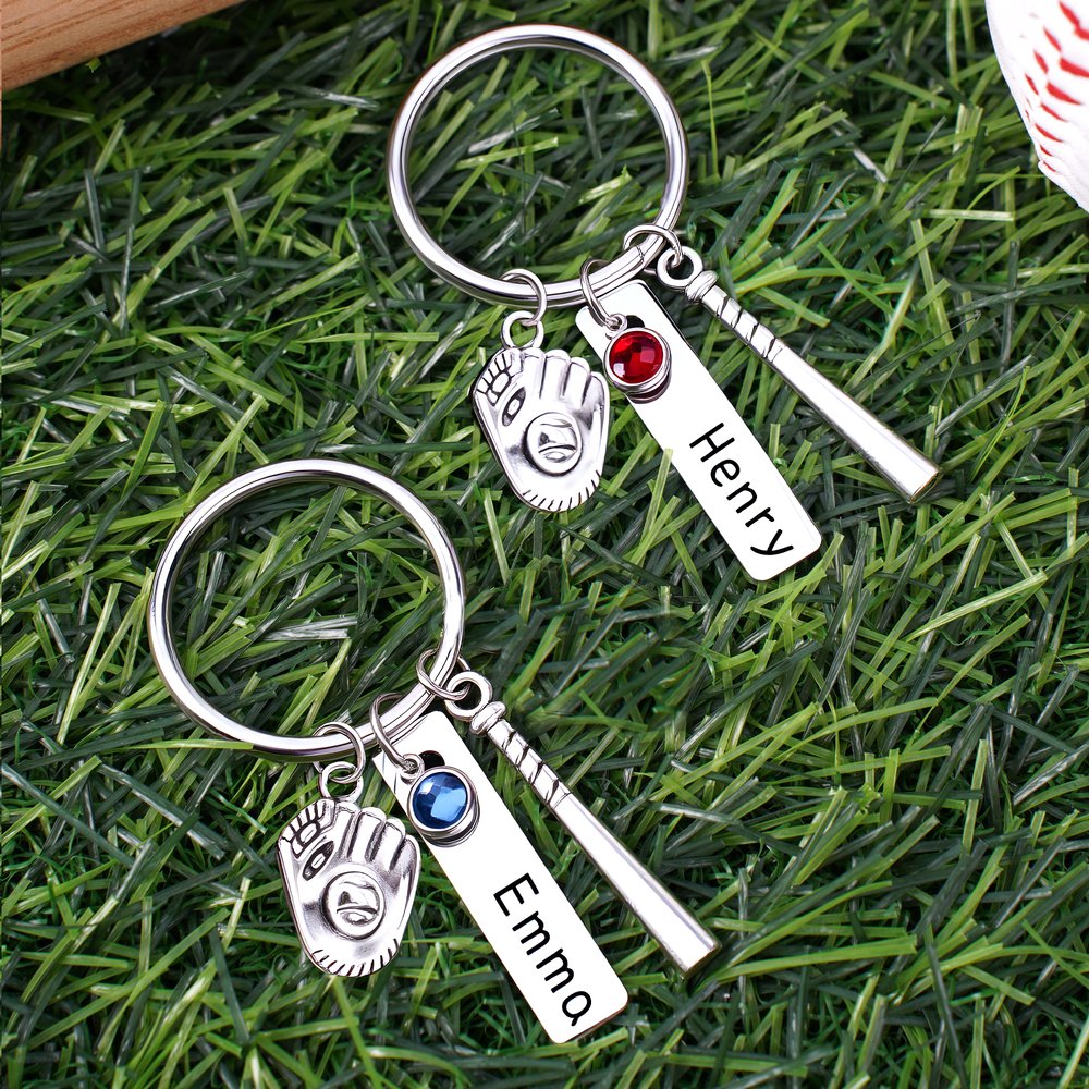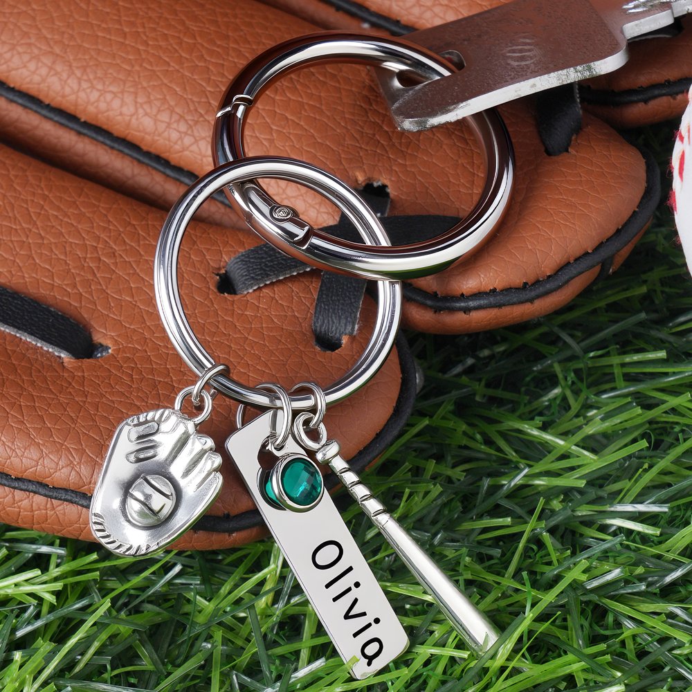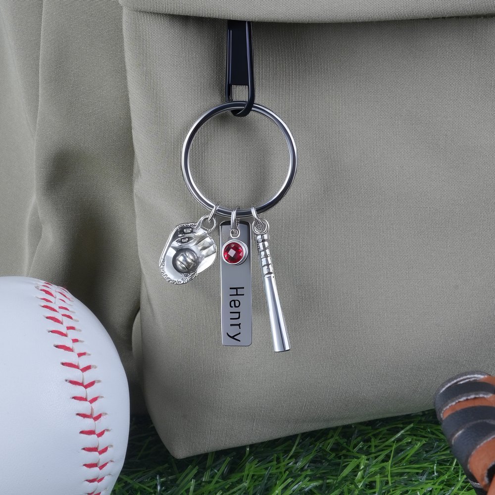 This keychain features a themed bat-and-glove design paired with customizable details: your chosen birthstone and engraved name. The combination of sports motifs, meaningful birthstones, and personal names turns a simple keychain into a unique, sentiment-filled accessory.